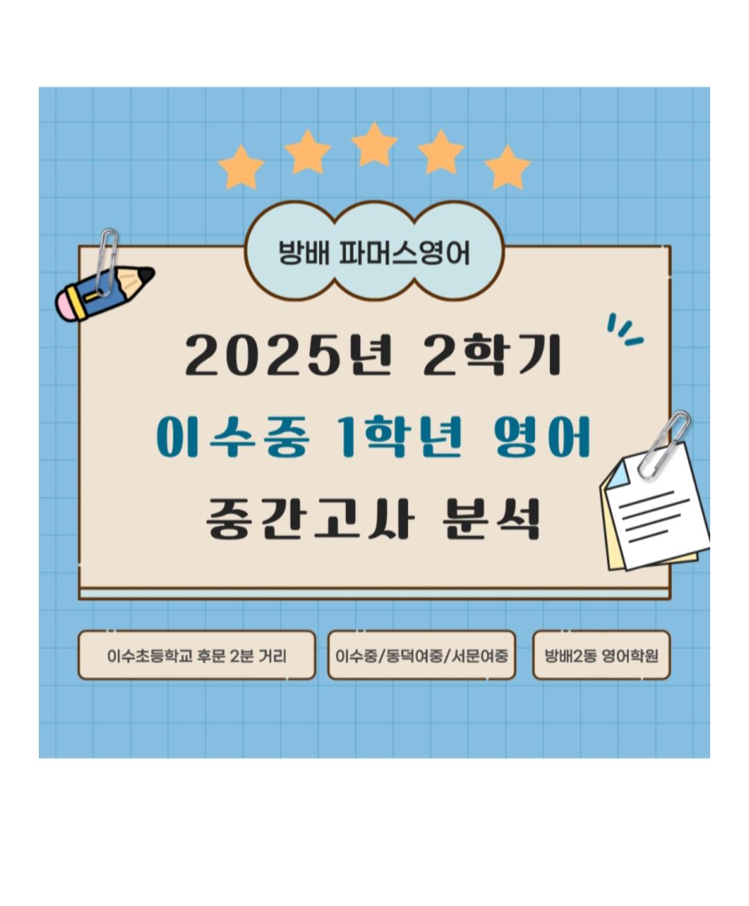 서울 방배동 이수중학교 1학년 시험분석입니다. 아래의 이미지를 참조해주세요 방배동 파머스영어 방배캠퍼스 지니원장입니다