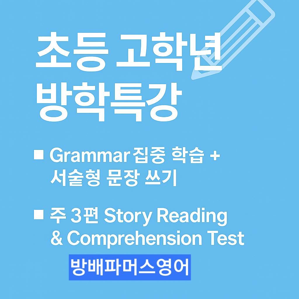 방배동 영어학원 방배파머스영어 지니원장입니다 이번 1~2월 겨울방학 동안 진행되는 초등 고학년 문법·서술형 집중특강 안내드립니다. 📘 매주 월요일 특강 수업 구성 ✔ Grammar 집중 학습 + 서술형 문장 쓰기 ✔ 주 3편 Story Reading & Comprehension Test 매주 월요일은 아이들의 문장 구조 이해력, 리딩 기초 체력, 그리고 서술형 쓰기 능력을 키우는 데 집중하는 날입니다. ■ 특강 수업 내용 안내 1) 문장 구조 분석 (Sentence Structure Analysis) 문장의 1~5형식을 정확히 구분하고, 문장에서의 주어·동사·목적어·보어·수식어 역할을 눈에 보이게 정리합니다. 문장 구조가 보이면 리딩 속도와 정확도, 말하기가 동시에 올라갑니다. 많은 학부모님들이 리딩 속도만 고민하시지만, 실제로는 “문장 구조가 보이느냐”가 실력 향상의 결정적인 지점입니다. 2) TO 부정사 완전 정리 to부정사를 명사처럼 쓰일 때(주어·목적어·보어) 형용사처럼 쓰일 때 부사처럼 쓰일 때 로 나누어 예문과 함께 정확하게 정리합니다. to부정사의 쓰임만 제대로 이해해도 리딩 지문의 이해도와 문장 해석력이 급격하게 달라집니다. 3) 서술형 문장 쓰기 훈련 아이들이 배운 문장 구조·to부정사 개념을 가지고 직접 문장을 변환·확장·재구성해보며 서술형 문장 쓰기를 진행합니다. ✔ 개념 → 구조 → 나만의 문장 만들기 이 흐름이 정확히 잡혀야 중학교 서술형 대비가 완성됩니다. 4) 매주 Story 3편 읽기 + 독해 테스트 주간 숙제는 스토리 3편 읽기이며, 수업 시간에 각 스토리당 5문항의 독해(comprehension) 테스트를 진행합니다. 스토리를 단순히 읽고 끝나는 것이 아니라, 문장 구조와 어휘, 핵심 문장을 다시 잡아주기 때문에 읽기 실력이 훨씬 단단해집니다.