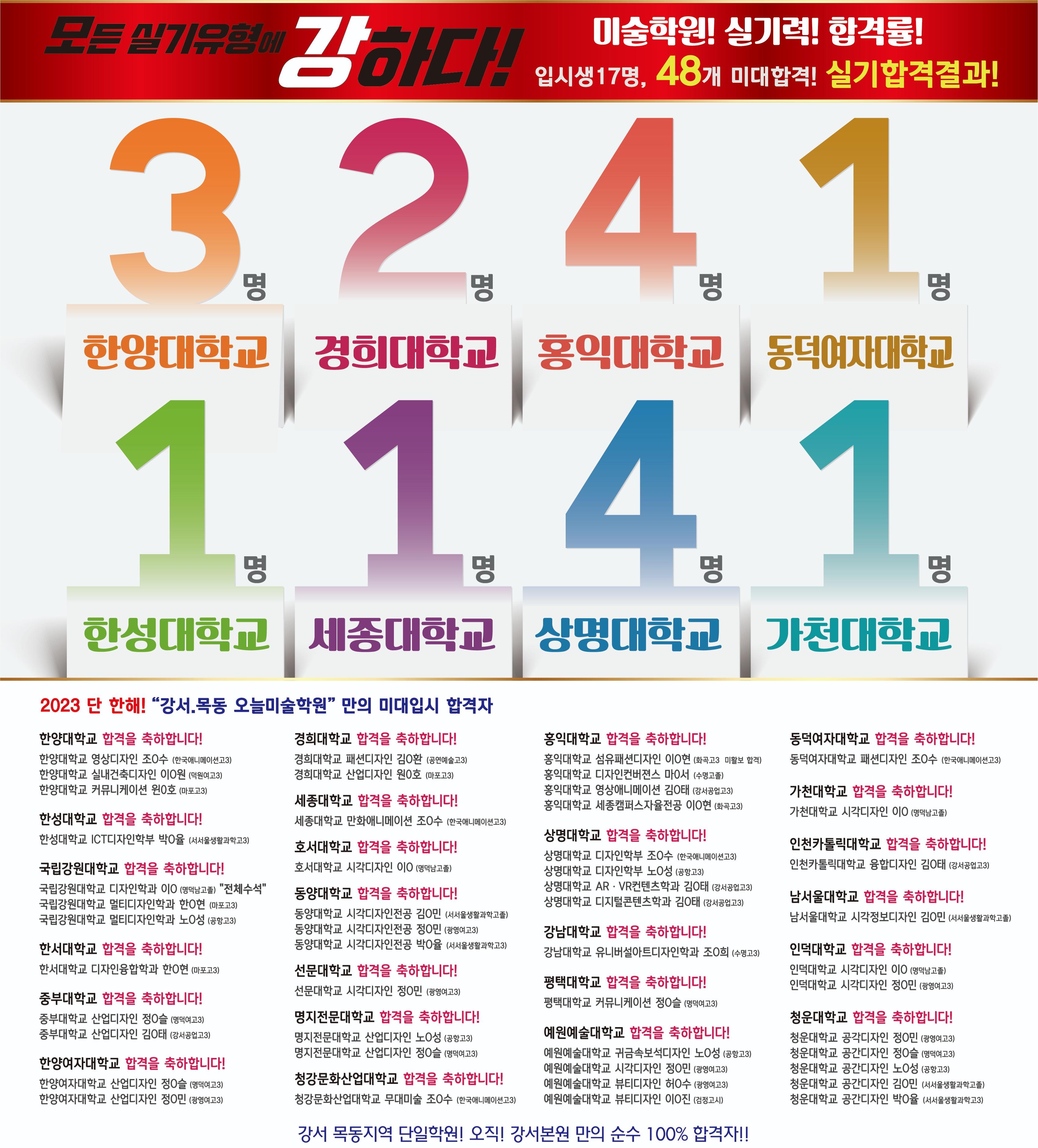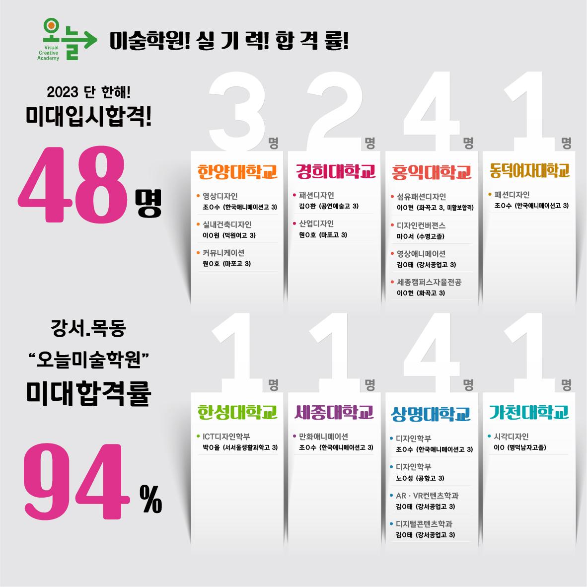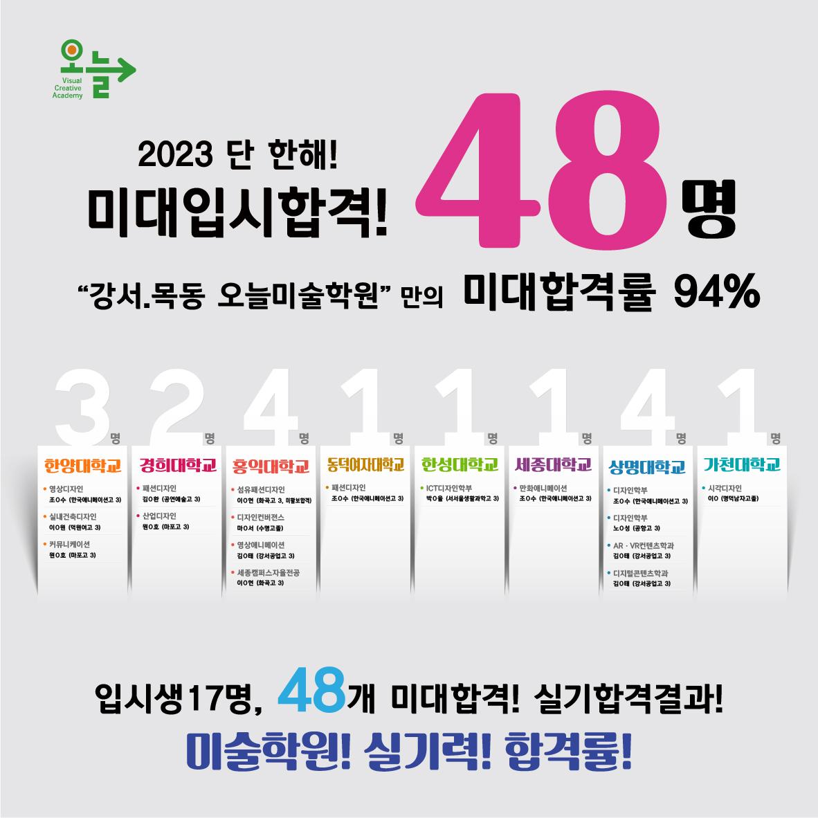 [ 미술학원은 실기합격 결과로 학원의 가치를 증명합니다! ] [ 2023학년도 미대입시 합격자! ] [ 2023학년도 미대입시 합격률 94%! ] [ 입시생 총17명 48개 미술대학 수시/정시합격 ] 2023 한양대학교 3명 전원합격! 2023 경희대학교 2명 전원합격! 2023 홍익대학교 4명 전원합격! 2023 동덕여자대학교 1명 합격! 2023 한성대학교 1명 합격! 2023 세종대학교 1명 합격! 2023 상명대학교 4명 합격! 2023 한성대학교 1명지원 1명 합격! 2023 가천대학교 1명 합격! 외 총48명 합격!! 30년전통의 오늘미술학원이 2023년도 힘차게 시작합니다. 오늘미술학원의 전학년 전임제 시스템 - 고등부 전원 입시반 선생님들 배치! 고등부,예고반 1.2.3학년- 평일반/주말반(토/일) 선택으로 학과와 실기관리 철저!!! 오늘미술학원 주말반 개강! 고등부(입시반)평일반: 화,수,목,금,토 (오후6시~오후10시) 고등부(입시반)주말반: 토(오전9시~오후10시 3타임) 일(오후2시~오후10시 2타임) 고등부(고1,고2)평일반: 월,화,수,목,금 (4일 선택), (오후6시~오후10시) 고등부(고1,고2)주말반: 토,일 (오전10시~오후7시 2타임) 예중/예고반 예고 예비반/입시반 평일 : 화,수,목,금 (오후6시~오후10시) 예고 입시반 주말: 토,일 (오전10시~오후7시 2타임) 입시는 입시전문가와 심층상담을 통하여 학과와 실기관리를 하여야만 성공적인 입시를 치룰 수 있습니다. 미대입시 합격행진은 블로그와 홈페이지를 통하여 보실 수 있습니다. 서울대, 국민대, 홍익대 s-class 원장직강 2023~2020년 국민대, 홍익대 s-class 원장직강! 입시인원 100% 합격 국민대학교 기초 소양/조형평가 100%합격! 2023학년도 입시생 총17명 48개 미술대학 수시/정시합격! 2023학년도 미대입시 합격률 94%