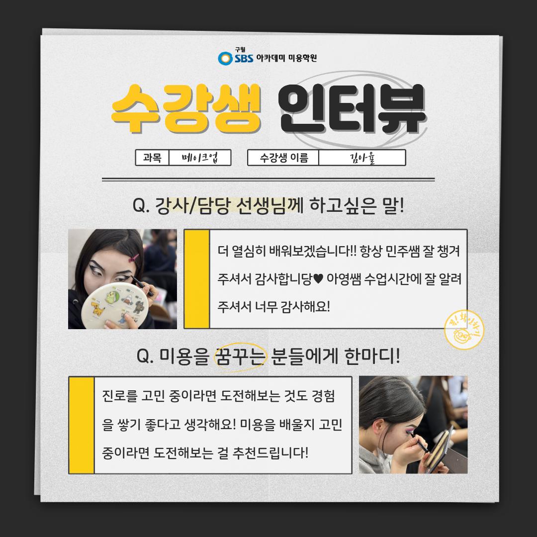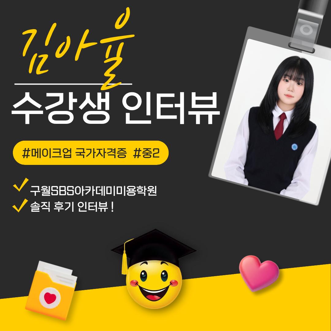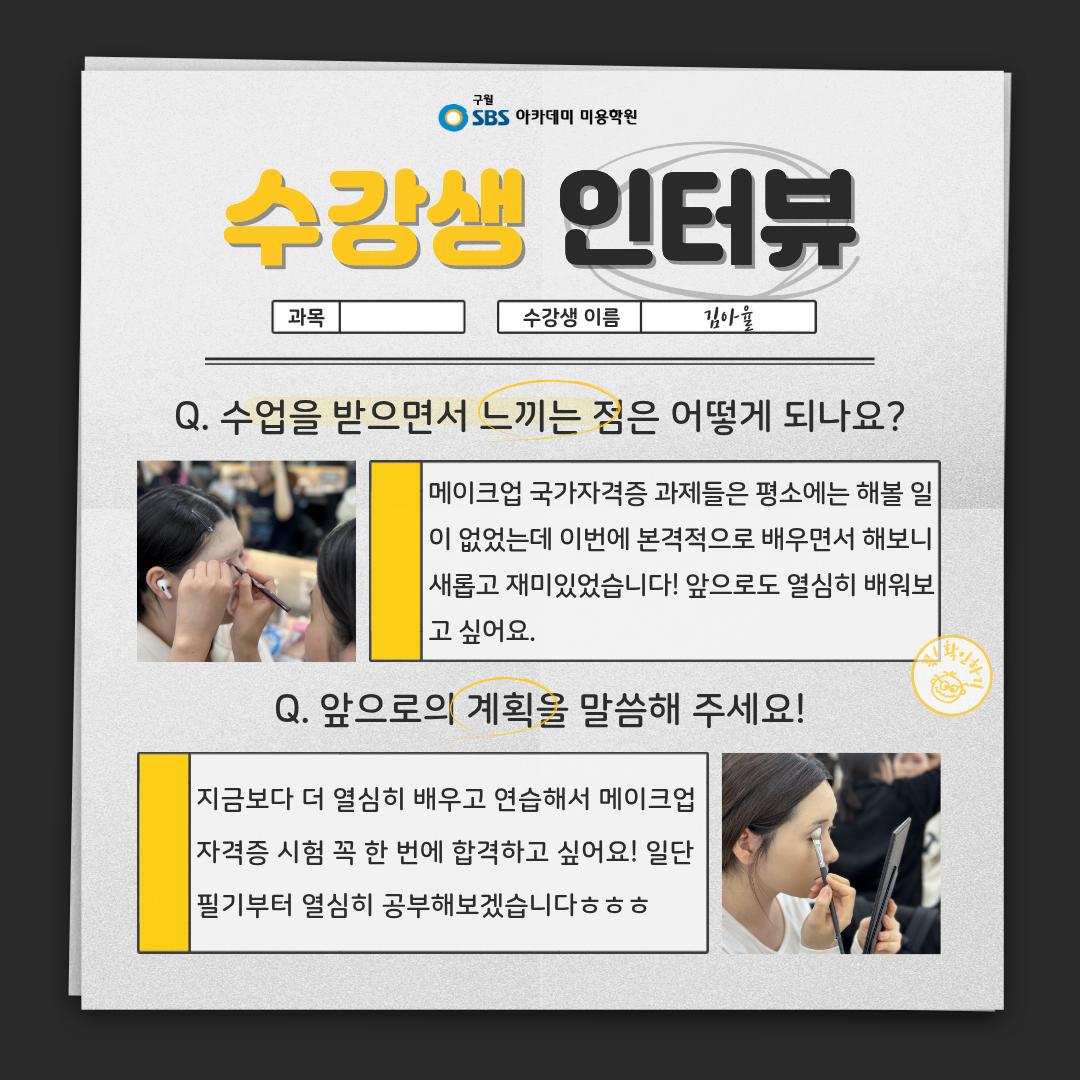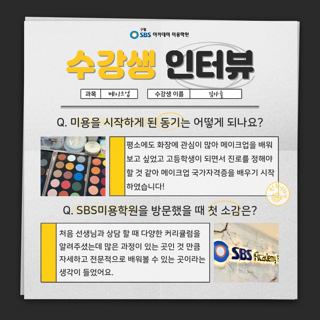 안녕하세요. 구월SBS아카데미미용학원입니다. 오늘은 메이크업 국가자격증 과정을 수강하고 있는 중학교 2학년 김아율 수강생의 인터뷰를 가져 왔습니다! 다같이 함께 보러 가실까요~? 032) 434-0630