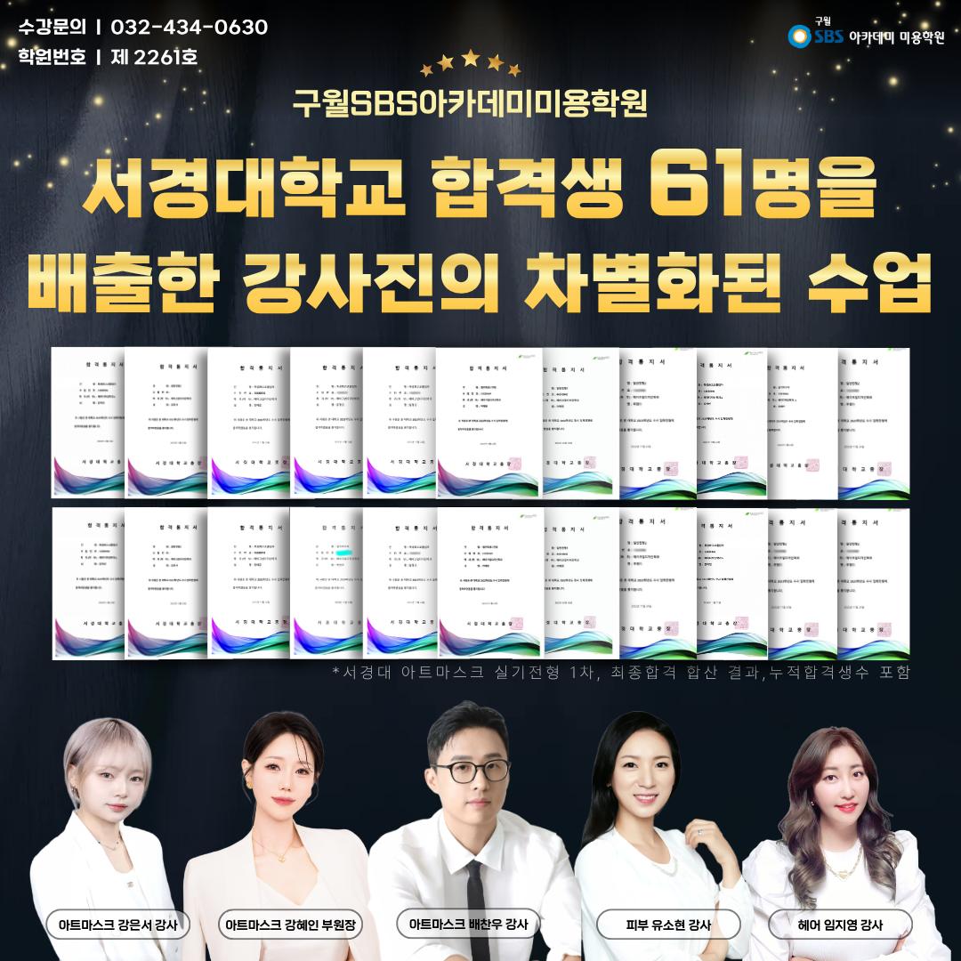 서경대학교 실기시험이 시행된 이후부터 2026년 현재까지 헤어/메이크업/피부 전공 합격자 총 61명 배출한 강사진들이 수업하는 곳! 결과로 증명하는 학원, 구월SBS아카데미미용학원입니다. 단순히 배우는 수업이 아니라 “합격”을 목표로 준비합니다. 지금 시작하는 학생들이 결과를 만들고 있습니다. 📌상담문의 032-434-0630