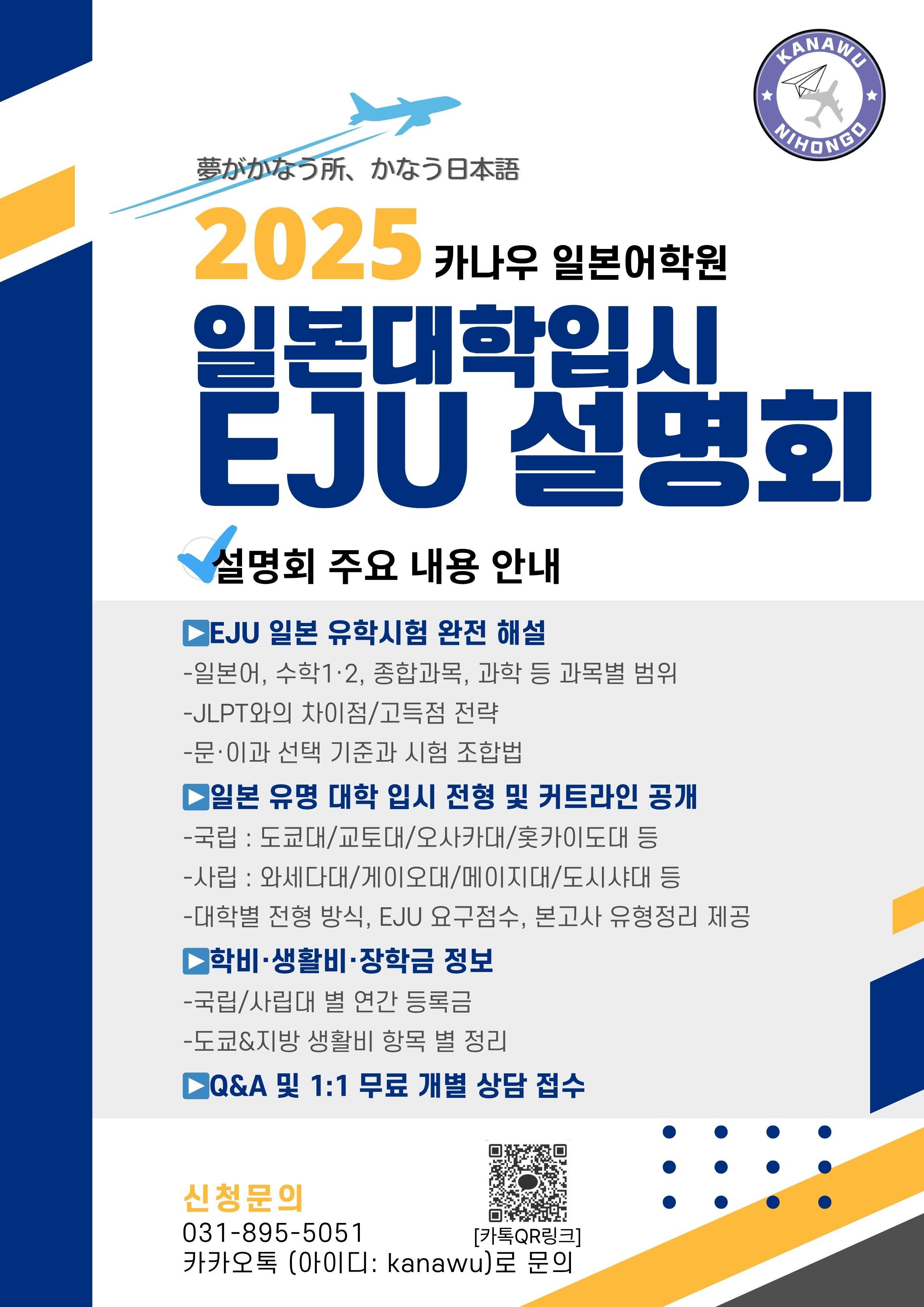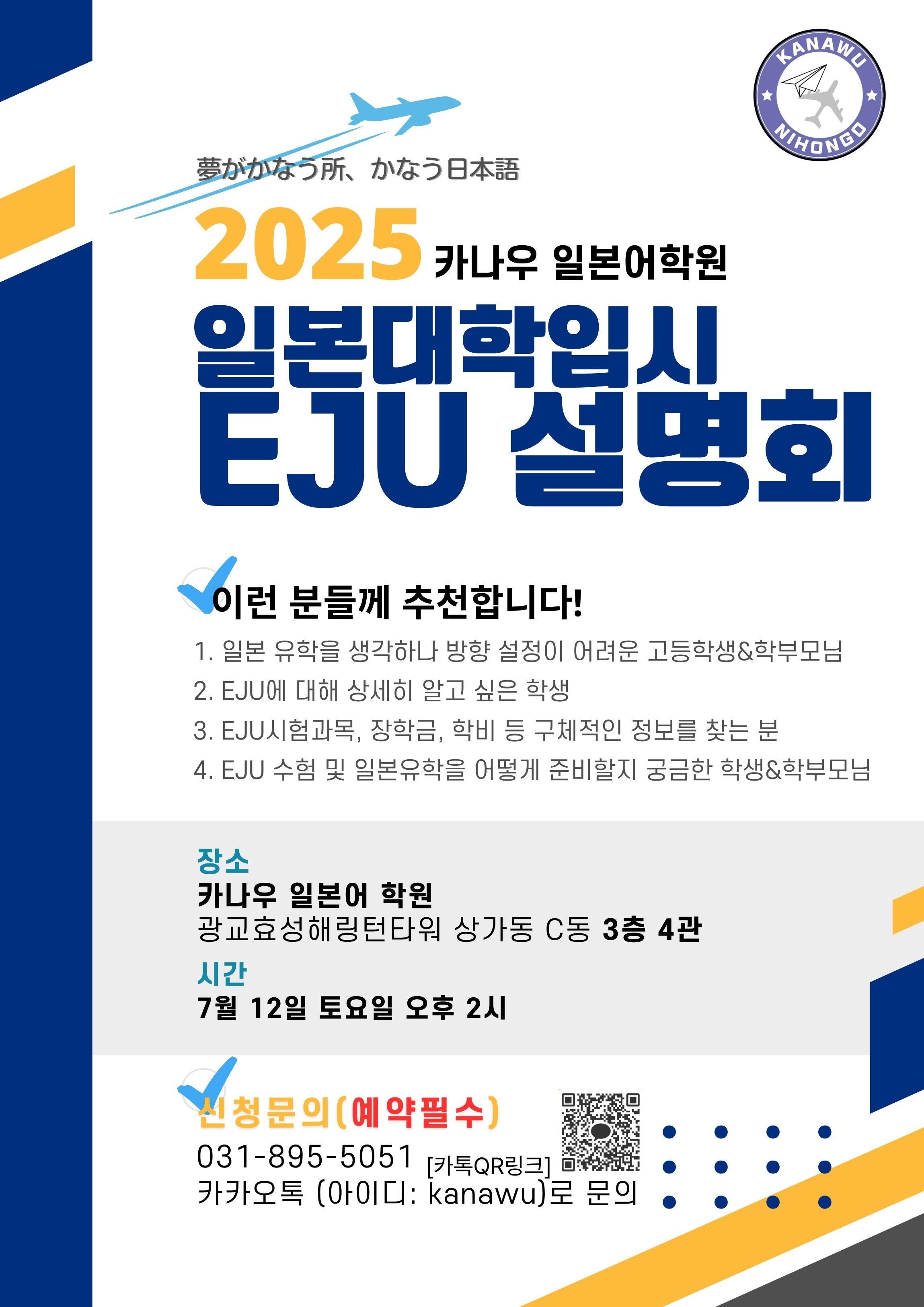 카나우 일본어 학원에서 2025년 7월 12일(토) 일본유학 준비를 위한 EJU 설명회를 진행합니다. 장소 카나우 일본어 학원 4관 예약: 전화/카카오톡/전화 문의 031-895-5051 카카오톡 (아이디: Kanawu) *설명회 이후 Q&A 및 1:1 무료 개별 상담 접수도 진행