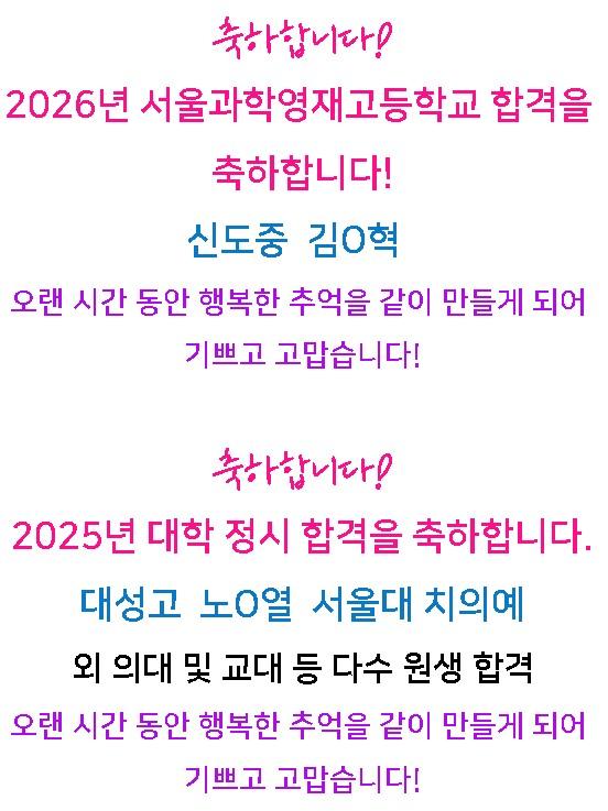 축하합니다! 2026년 서울과학영재고등학교 합격 신도중 김 O 혁 2025년 대학 정시 합격 대성고 노 O 열 서울대 치의예 외 의대 및 교대 등 다수 2024년 대학 수시 합격생 대성고 김 O 윤 서울대 대성고 홍 O 완 연세대 외 다수