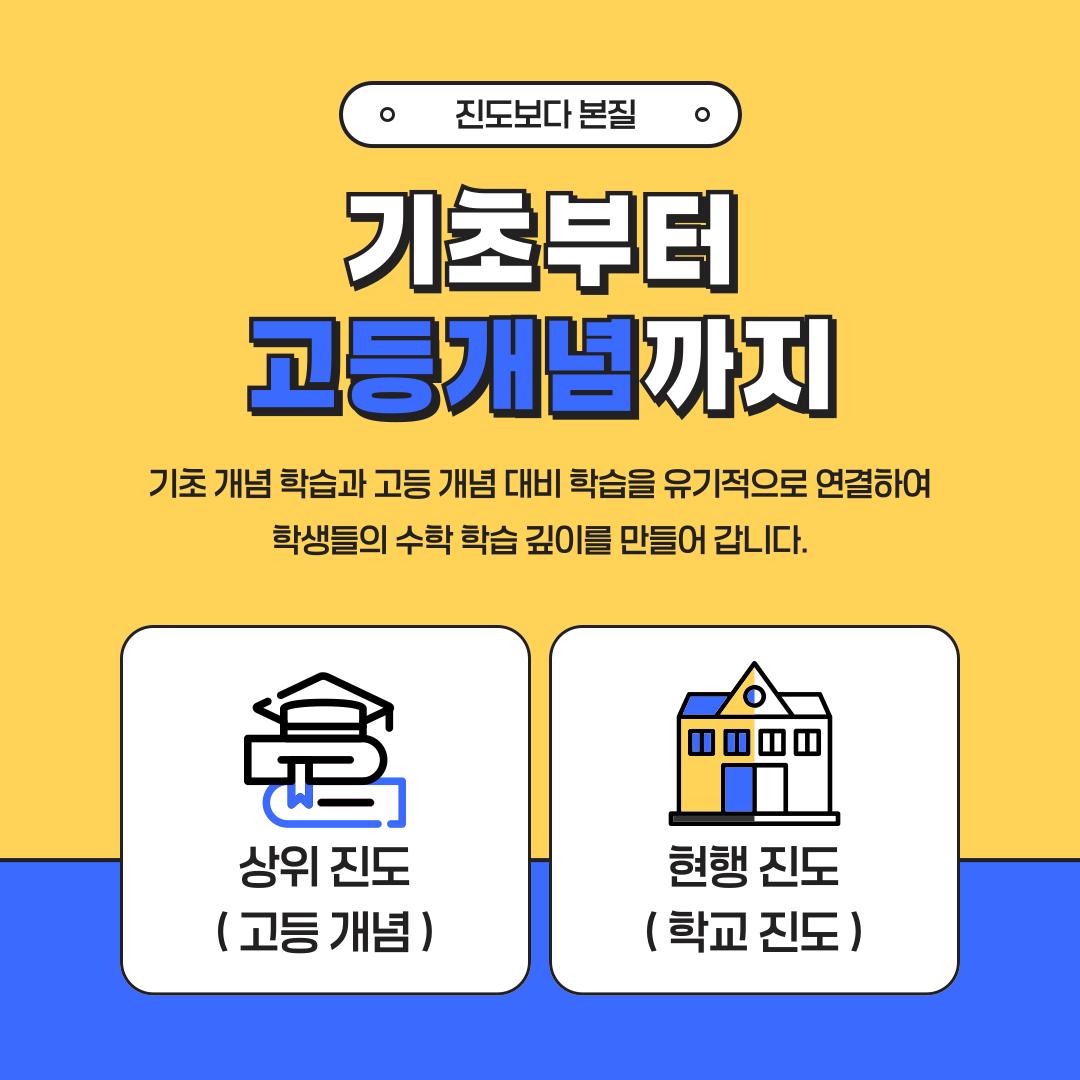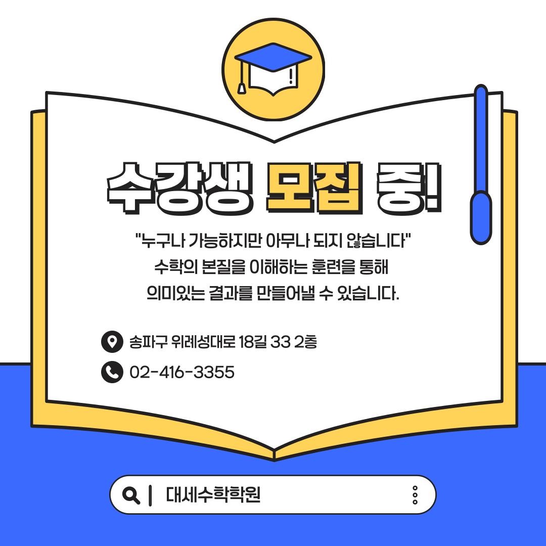 저희 학원은 단순히 문제만 많이 풀게 하는 방식이 아닌, 예습 기반의 기초 심화 학습을 통해 학생 스스로 사고하고 이해하며 실력을 쌓아가는 수업을 운영하고 있습니다. 수학 실력은 습관입니다 “누구나 가능하지만 아무나 되지 않습니다” 학습은 결국 성실함의 싸움입니다. 단기간 점수 향상이 아닌, 고등수학을 미리 대비하며 수학의 본질을 이해하는 훈련을 통해 어떤 학생이든 충분히 의미 있는 결과를 만들어낼 수 있습니다. 지금 대세학원에서 아이의 수학, 함께 성장시켜 보세요.