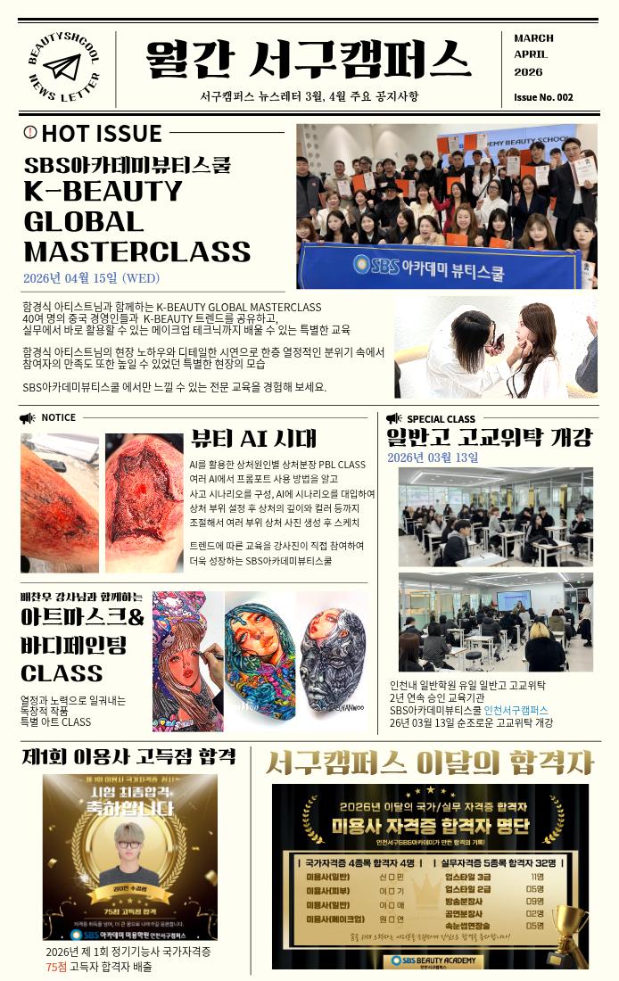 2026년 3,4월호 1. K-BEAUTY GLOBAL MASTER CLASS 함경식 아티스트와 함께하는 현장 노하우! 40여명의 중국 경영인들과 K-BEAUTY 트렌드를 공유하는 시간 2. 뷰티 AI 시대 3. 배찬우 강사님과 함께하는 아트마스크 & 바디페인팅 CLASS 4. 일반고 고교 위탁 개강 5. 이용사 고득점 합격자 소개 6. 3,4월 국가자격증 및 민간자격증 취득자 총 36명