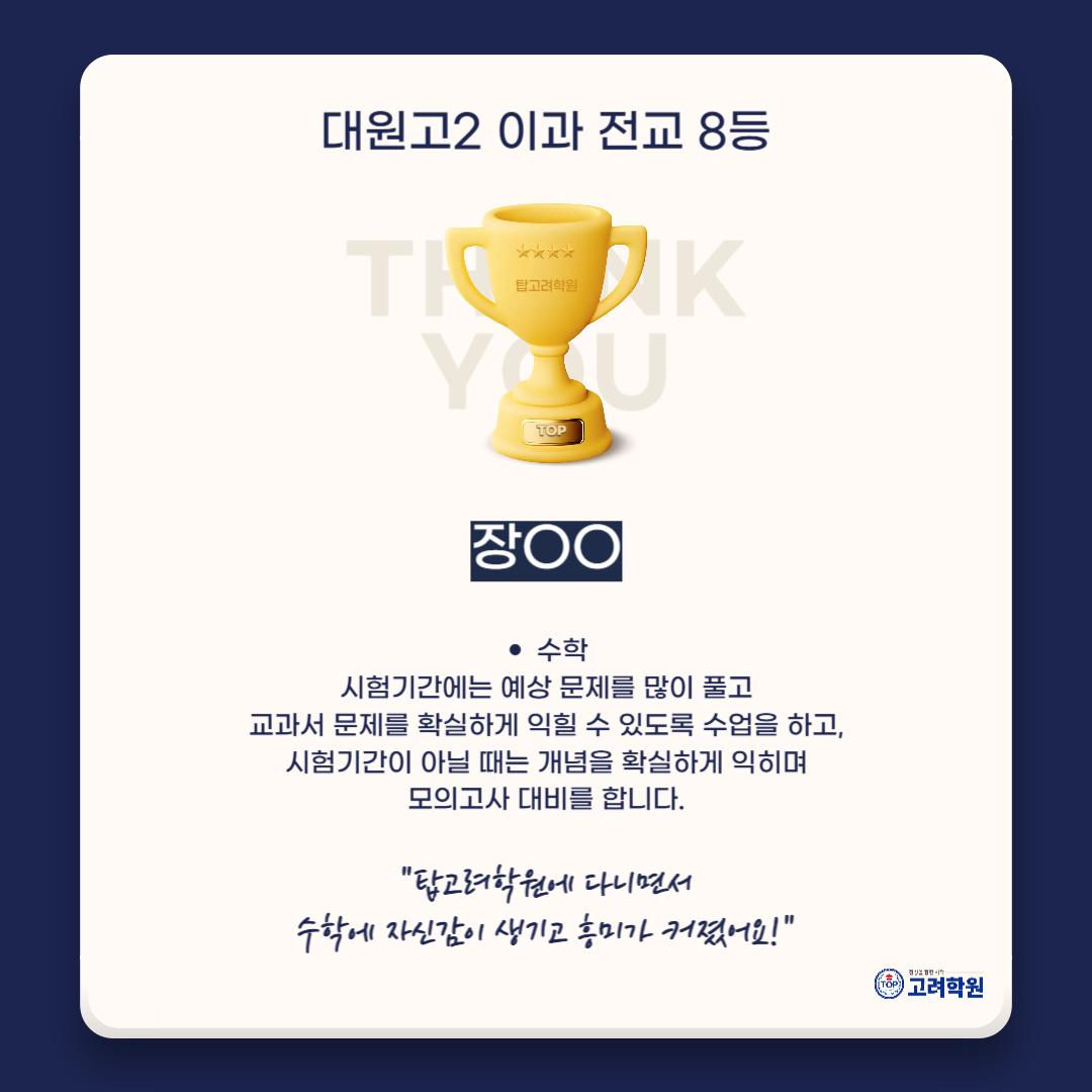 🔥전교권의 비결, #TOP고려학원 스카이 고등부!🔥 ⠀ #중곡동학원 #탑고려학원 스카이 #고등부 ⠀ 🎓 2025년 1학기 중간고사 #대원고 2학년 이과 전교 2등 이○○ 전교 8등 장○○ 쾌거 달성! 👏👏 ⠀ 꾸준한 노력, 집중 수업, 철저한 관리의 결과! 우리 학생들, 정말 자랑스럽습니다💪 ⠀ 곧 다가올 기말고사도 TOP고려학원이 끝까지 책임지고 함께합니다! ⠀ 📌 더 많은 후기는 블로그에서 확인하세요! 🔗 [블로그 링크] https://blog.naver.com/kevin-t/223901978846