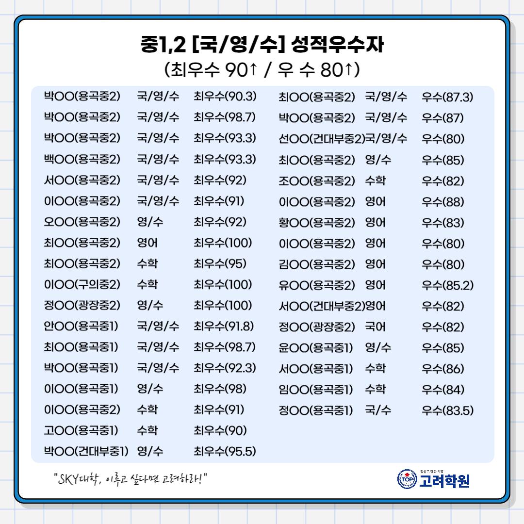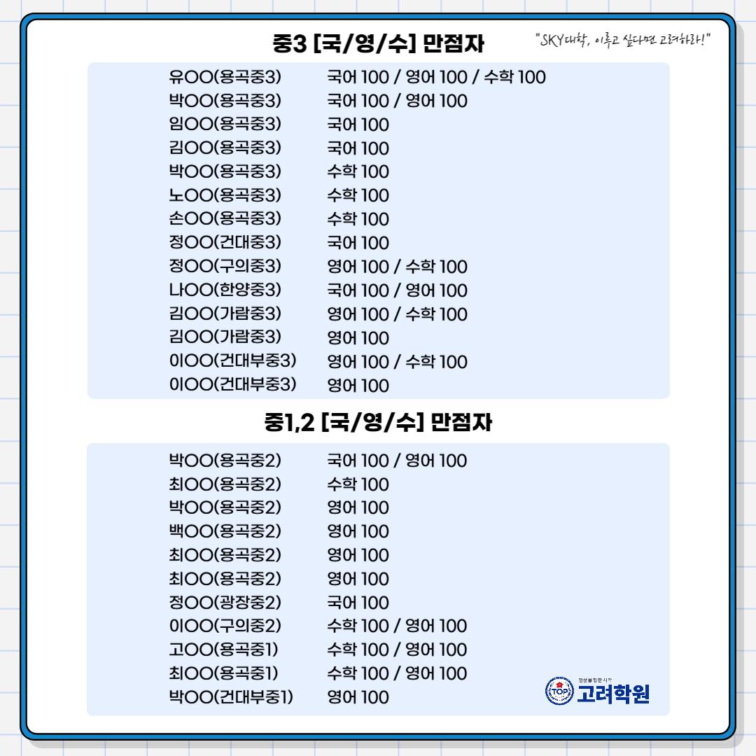 안녕하세요 #중곡동학원 #고려학원 미라클 #중등부 입니다😊 . 오늘은 2025년 1학기 중간/기말에서 #TOP고려학원 [이센셜 중등부] 학생들이 거둔 우수한 결과에 대해 이야기해보고자 합니다👏👏 #전교1등 🌟 #만점자 💯 #성적우수 🏆 #성적향상 📈 까지!! 정말 자랑스러운 우리 고려학원 학생들입니다! . 탑고려학원은 앞으로도 철저한 관리와 완벽한 #커리큘럼 #내신대비 으로 학생들의 2학기 성적도 확실하게 책임지겠습니다! . 📌 더욱 자세한 내용은 아래 블로그에서 확인하세요! https://blog.naver.com/kevin-t/223960890433