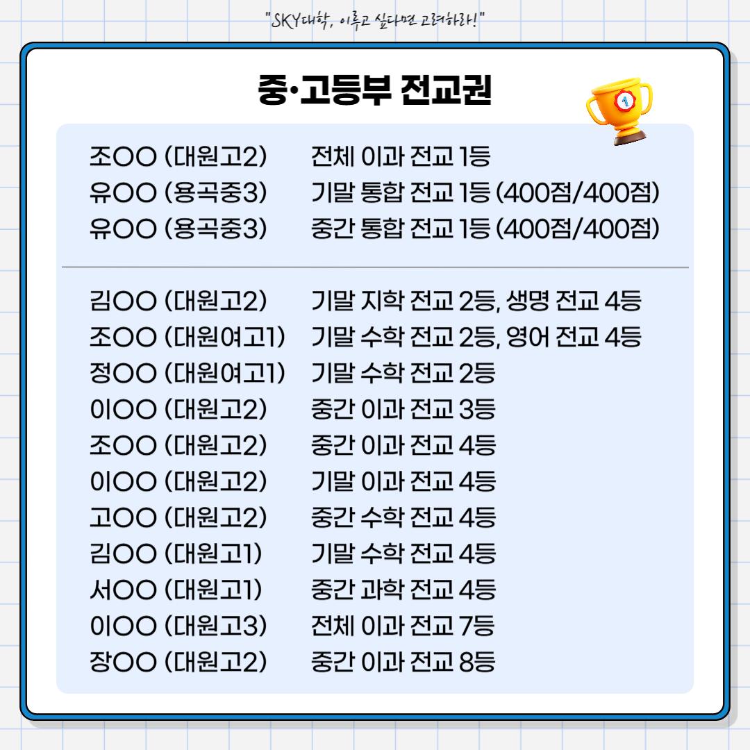 25년 1학기 중등부 전교 1등, 만점자, 성적우수자 배출!