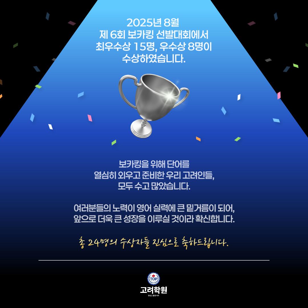 🎉 #수상소식 | #고려학원 x #보카킹선발대회 🎉 25년 8월 18~19일, #중곡동영어학원 고려학원에서 개최된 📘 제6회 보카킹(Voca King) 선발대회 📘 👏 우리 고려학원 학생들이 ✨ 최우수상 15명, 우수상 8명 ✨ 총 24명 수상의 영광을 안았습니다! 🎊 💯 이 중 11명은 만점 수상자! 🏆 우리 학생들 정말 자랑스럽습니다💙 👉 자세한 소식은 블로그에서 확인하세요! 🔗 https://blog.naver.com/kevin-t/224019861938