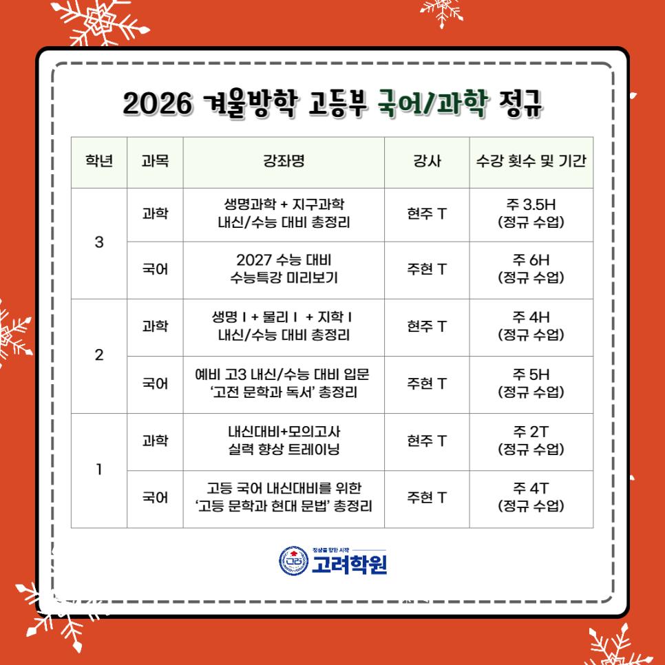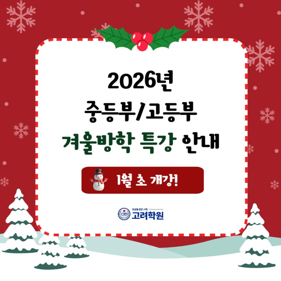 안녕하세요 #중곡동학원 #고려학원 입니다😊 곧 중·고등부 학생들의 겨울방학이 시작될 예정입니다. 겨울방학은 새 학년을 대비할 수 있는 중요한 시기이지만, 자칫하면 학업 리듬이 해이해지기 쉬운 시기이기도 한데요. 이에 #광진구학원 고려학원에서는 재원생들이 겨울방학 동안 학업 페이스를 잃지 않고 개인별 취약점을 보완하며 새 학년을 준비할 수 있도록 2026학년도 대비 #중등부 #고등부 #겨울방학특강을 진행합니다! 다가오는 2026년도, 목표를 향해 힘차게 나아갈 수 있도록 알찬 겨울방학을 고려학원과 함께 준비해 보세요 ❄️📚 더욱 자세한 내용은 아래 고려학원 블로그에서 확인해주세요😀 https://blog.naver.com/kevin-t/224119632073