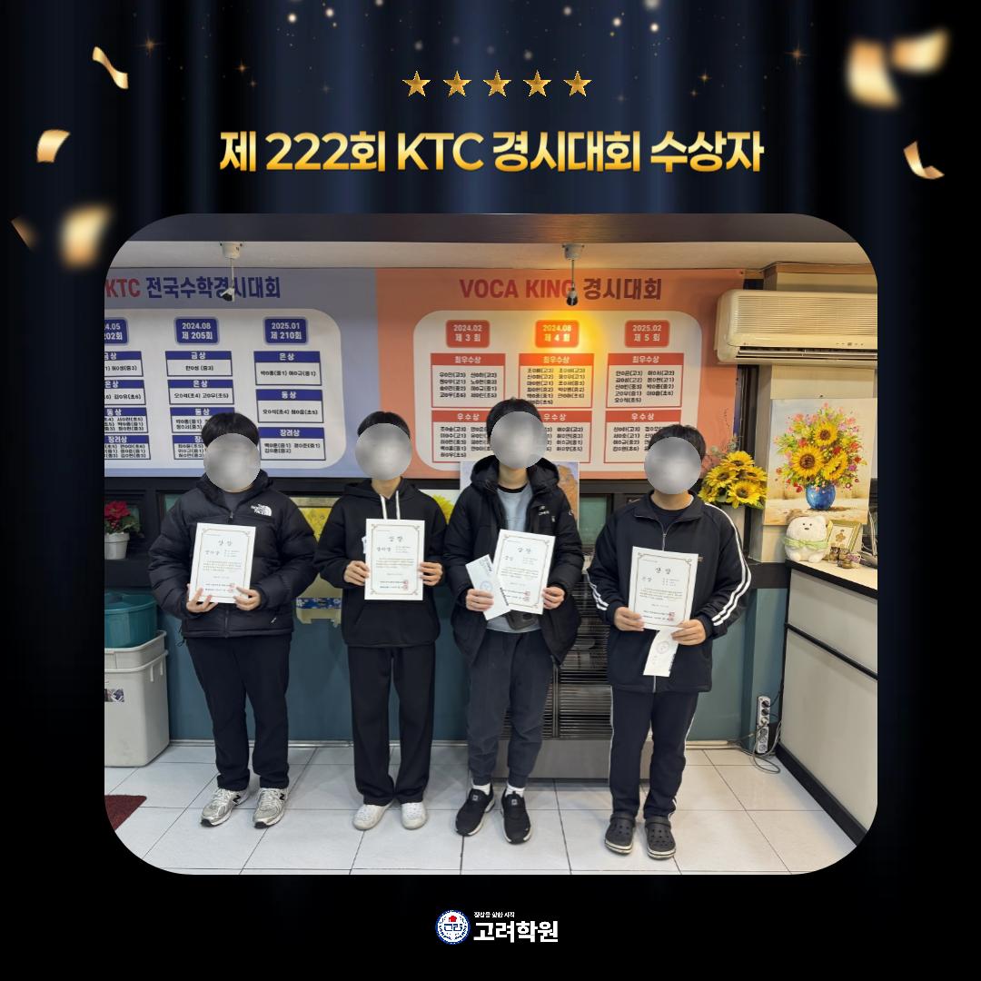 🎉 #수상소식 | #고려학원 x #KTC전국수학경시대회 🎉 26년 1월 8~9일, #광진구수학학원 고려학원에서 열린 📘 제222회 KTC 전국수학경시대회 📘 우리 학생들이 만들어낸 결과는👇 🏅 금상 3명 🥈 은상 2명 🥉 동상 4명 🎖 장려상 2명 ➡️ 총 11명 수상 전국 기준으로도 우수한 수학 실력을 인정받은 우리 학생들 정말 자랑스럽습니다💙 👉 자세한 소식은 블로그에서 확인하세요! 🔗 https://m.blog.naver.com/kevin-t/224169868727