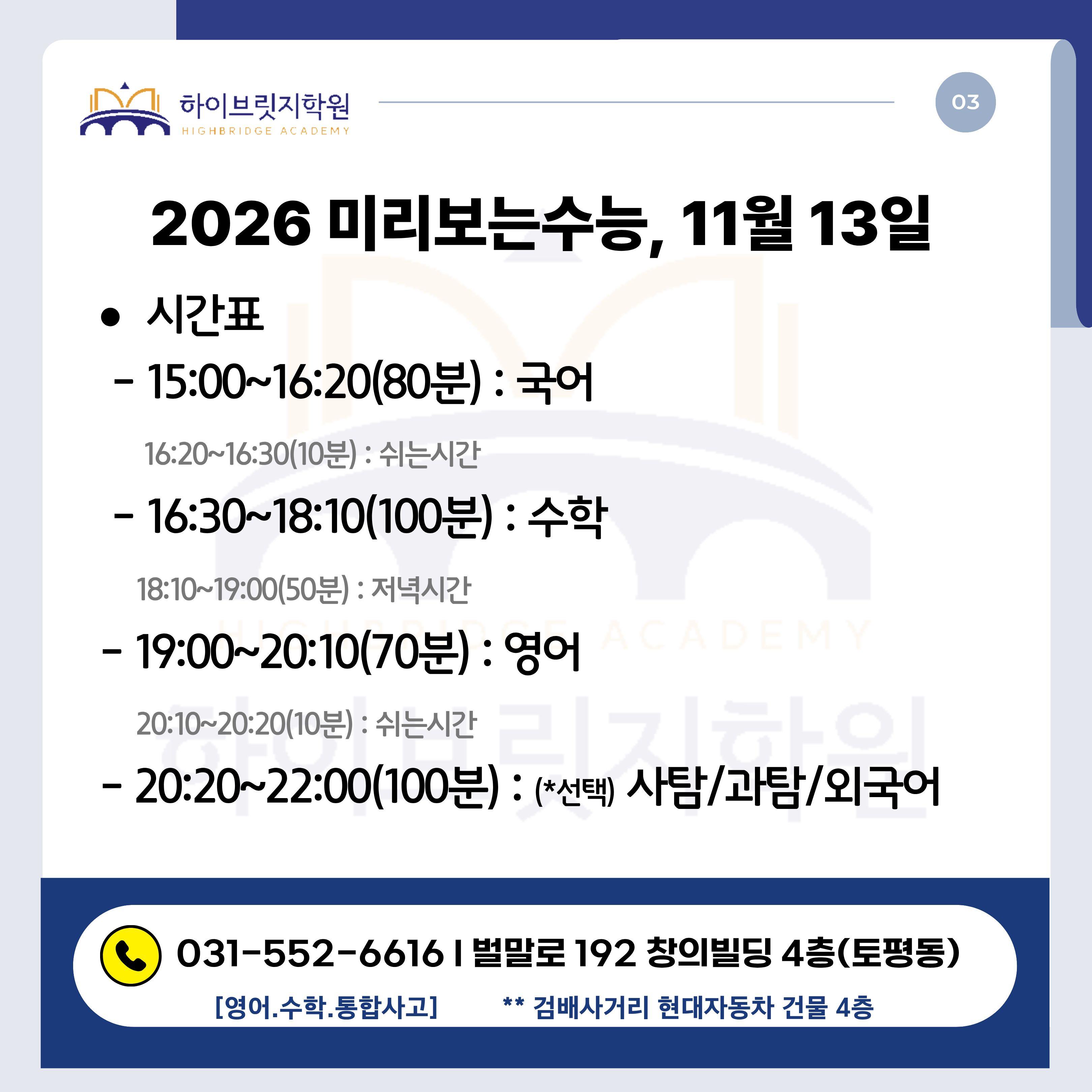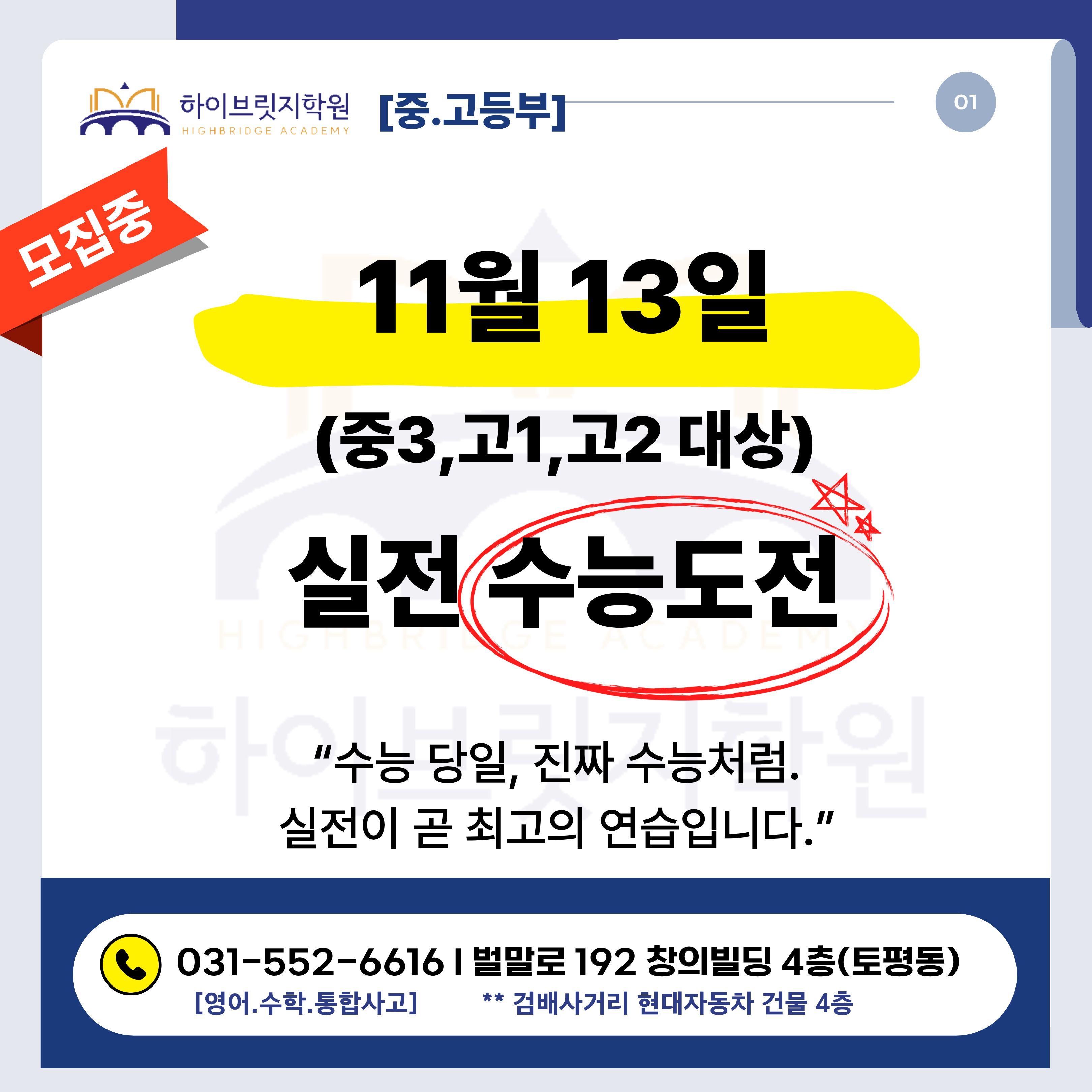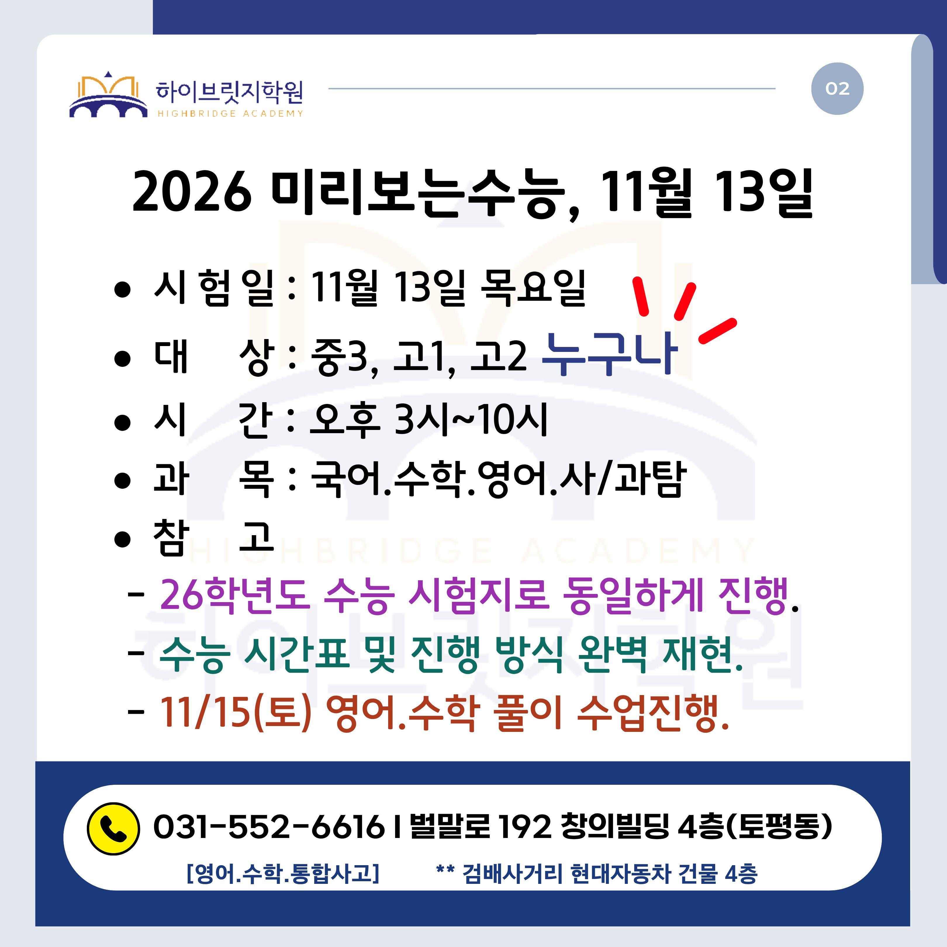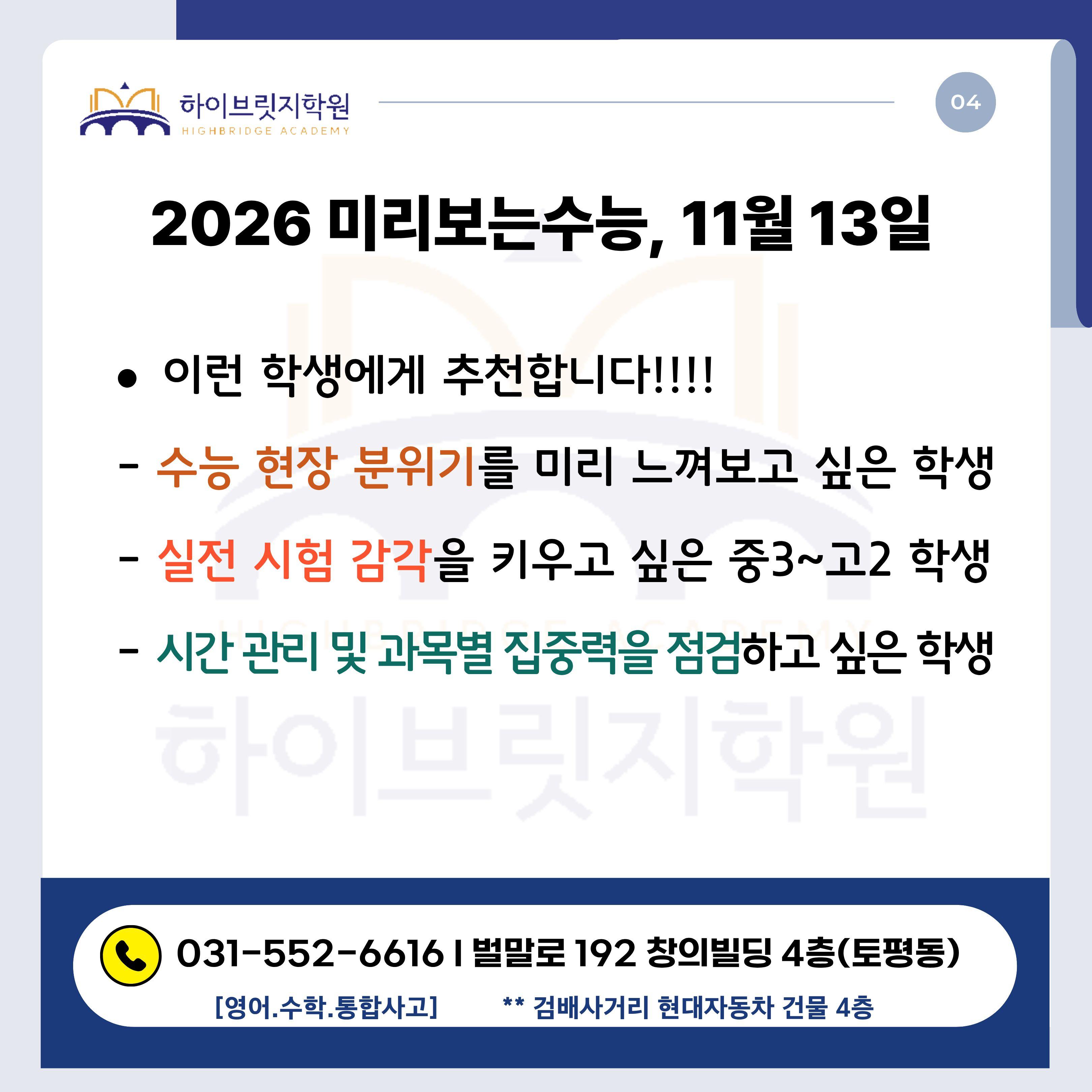 2026 미리보는 수능 – 실전 수능도전 (11월 13일 목요일) 수능 당일, 진짜 수능처럼! 단 하루, 실전 감각을 익히는 최고의 리허설! 하이브릿지학원에서는 2026학년도 수능 시험과 동일한 환경에서 중3·고1·고2 학생들을 위한 ‘실전 수능도전’ 프로그램을 진행합니다. ✏️ 신청방법 (선착순 마감) https://naver.me/xlbM0DXI 또는 학원으로 문의해주세요. 📞 031-552-6616 / 010-9945-6617