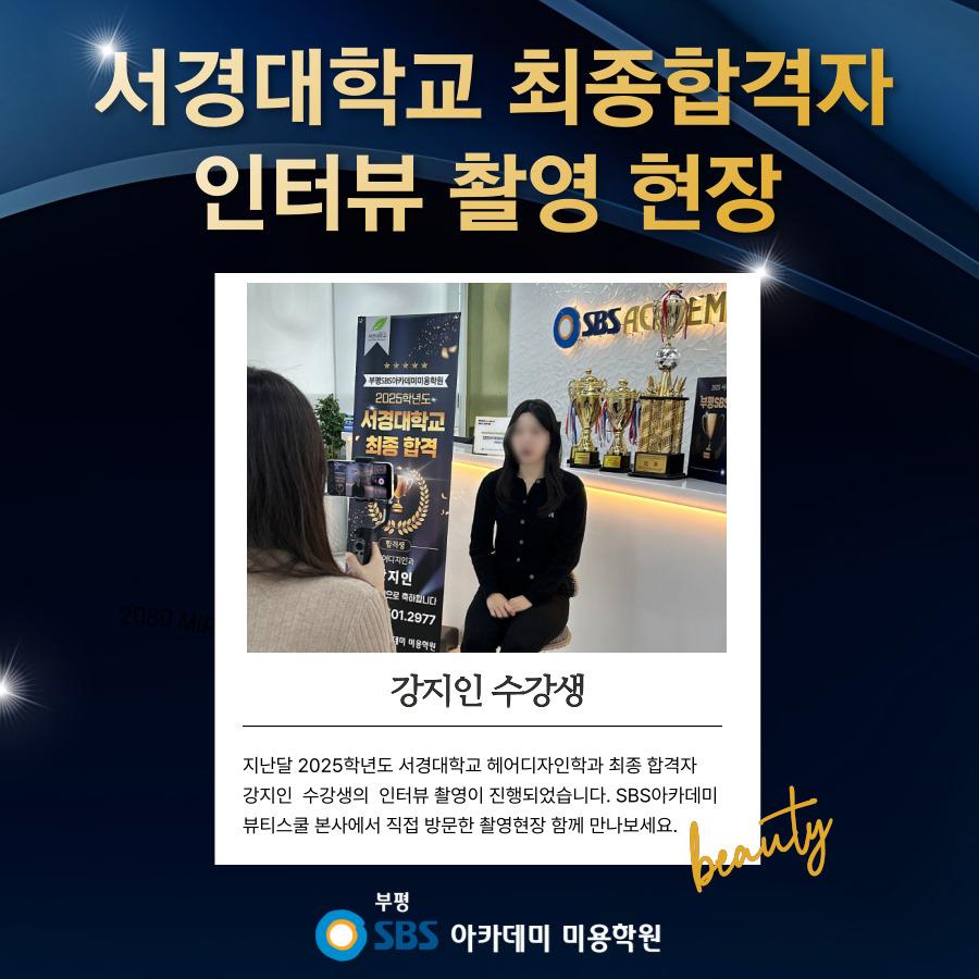 안녕하세요. 부평SBS아카데미미용학원입니다. 지난달 SBS아카데미뷰티스쿨 본사에서 직접 방문하여 2025학년도 서경대학교 최종 합격자 강지인 수강생의 인터뷰 촬영을 진행하였습니다. 촬영을 시작하면서 긴장을 하기도 하였는데요. 합격 하기까지의 스토리를 이야기하면서 자신 있는 모습으로 촬영을 마무리하였답니다. 촬영 영상은 유튜브에서 확인하실 수 있습니다. 교육문의: 032 - 501 - 2977