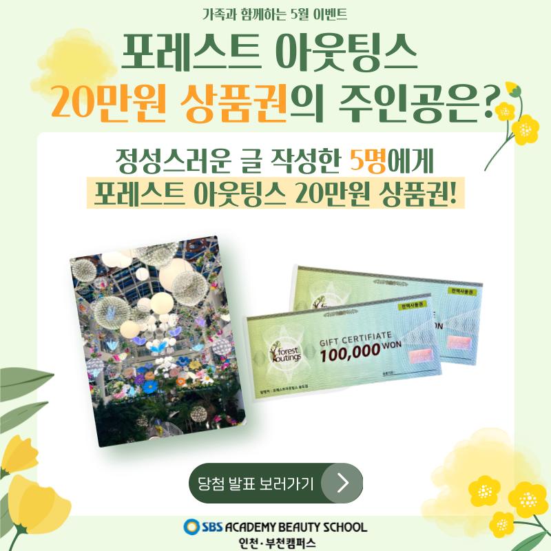 안녕하세요~ 부평SBS아카데미미용학원입니다:) 가정의 달 5월~!! 가족의 소중함을 다시 한번 돌아보게 되는 달인데요. 저희 부평캠퍼스에서도 뜻 깊은 이벤트가 진행되었답니다. 바로~ 가족과 함께한 시간들을 학원 카페에 공유해보는 이벤트였는데요. 많은 수강생분들께서 참여주셔서 감동이었습니다. 부모님과 함께한 시간, 할머니, 할아버지와 함께한 시간, 반려묘, 반려견과 함께한 시간등등 정말 많은 이야기를 공유해주셔 훈훈한 감동스토리를 읽느라 시간 가는줄 모르겠더라고요. 이벤트의 하이라이트~ !!!바로 송도에 위치한 포레스트아웃팅스의 상품권 20만원~!!! 총 5분께 전달드릴수 있는 기회가 주어졌는데요. 당첨자분들께서는 가족분들과 맛있는 식사하셔 또하나의 추억을 남길수 있었으면 좋겠습니다. 항상 수강생분들께 좋은 기억으로 남을 수 있도록 최선을 다 하는 부평SBS아카데미미용학원이 되겠습니다. 교육 문의 : 032 - 501 - 2977