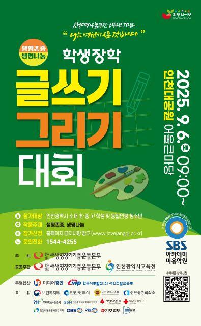 안녕하세요~ 부평SBS아카데미미용학원입니다! 225.09.06 인천대공원에서 글쓰기/그리기 대회가 개최됩니다. 인천광역시 소재 초, 중, 고등학생 및 동일연령 청소년이 모두 참여할 수 있습니다~ 작품의 주제는 생명존중과 생명나눔! SBS아카데미미용학원과 함께 하는 글쓰기/그리기 대회! 기업 후원 장학금이 3000만원 정도 시상 될 예정입니다~! 생명의 존중과 나눔, 사랑의 의미와 가치를 학생 스스로 되짚어보고 생명나눔주간을 맞아 몸소 실천하신 분들의 사랑과 희생 정신을 기르는 목적입니다! 행사일시 : 2025년 9월 6일 (토) 9:00~14:00 행사장소 : 인천대공원 어울큰마당 일대 행사대상 : 인천지역내 초중고 재학생 및 동일 연령대 청소년
