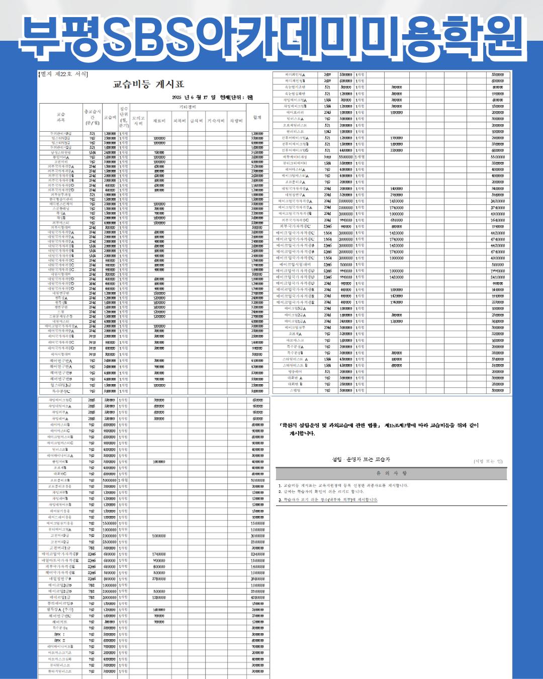 안녕하세요. 부평SBS아카데미미용학원입니다. 수강료 변동사항 안내드려요. 자세한 안내가 필요하시다면 문의주세요.^^ 032-501-2977