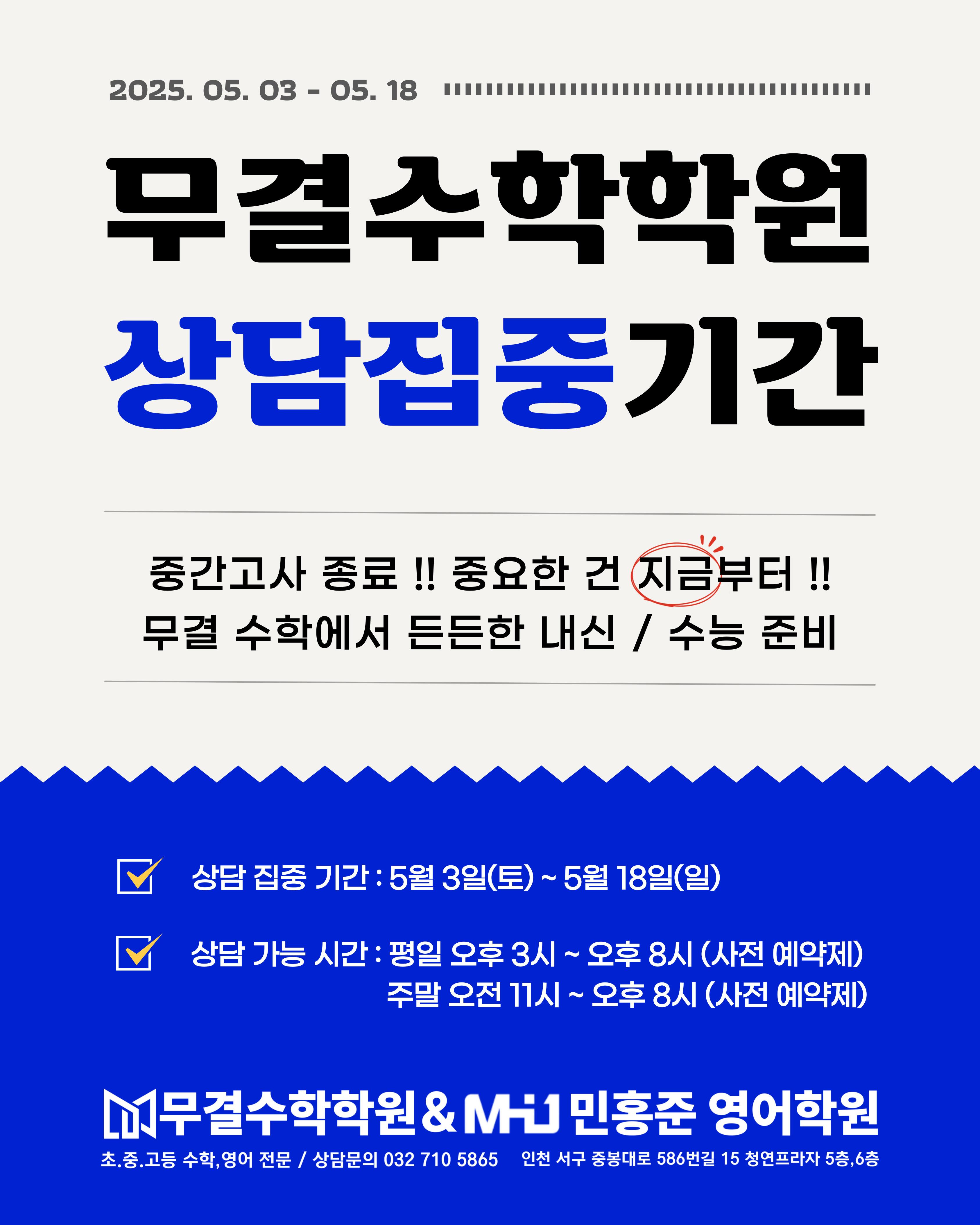 [무결수학학원 상담 집중 기간 안내] 안녕하세요, 무결수학학원입니다. 항상 우리 학원을 믿고 찾아주시는 모든 학생과 학부모님께 감사드립니다! 5월 3일(토)부터 5월 18일(일)까지 상담 집중 기간을 운영합니다! 이번 상담 집중 기간은 1학기 중간고사 이후, 학생 개개인의 학습 상황을 점검하고 맞춤형 학습 계획을 수립하기 위해 마련되었습니다. 상담 가능 시간 평일: 오후 3시 ~ 오후 8시 주말: 오전 11시 ~ 오후 8시 학생 개인별 학습 진단, 향후 학습 방향, 성적 향상 전략 등에 대해 1:1 맞춤 상담을 진행하오니, 많은 관심 부탁드립니다! 상담 예약은 네이버 예약 또는 유선 전화로 사전 예약하실 수 있습니다 우리 청라수학학원 무결수학학원은 항상 학생들의 성장을 최우선으로 생각합니다. 네이버 지도, 네이버 예약, 네이버 플레이스를 통해 간편하게 상담 신청이 가능합니다. 감사합니다!