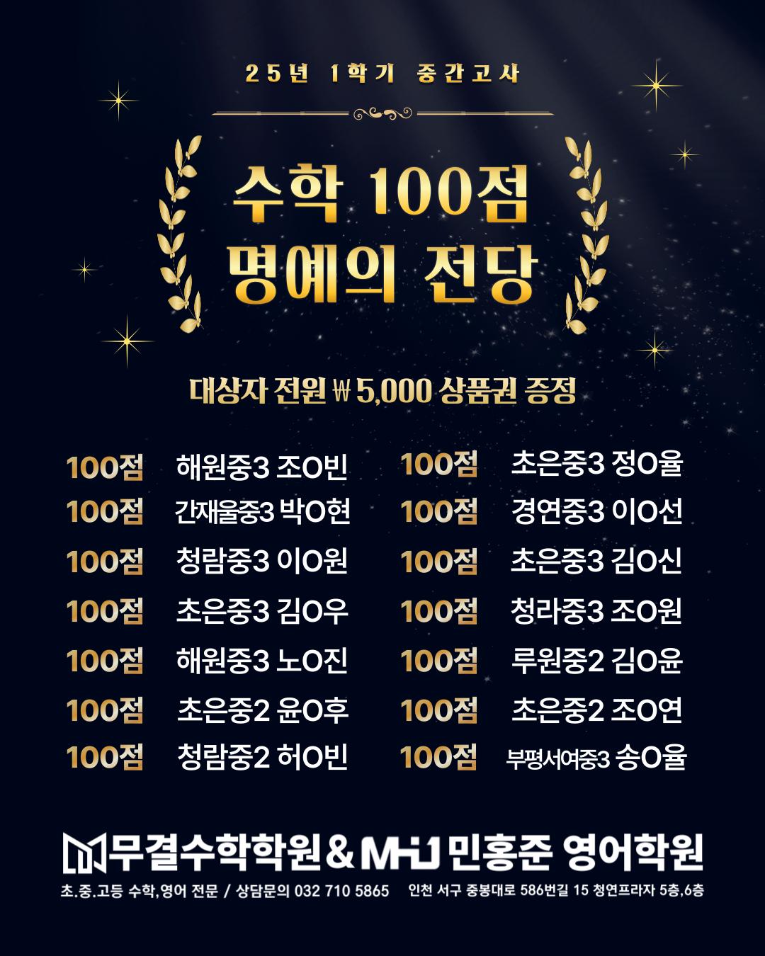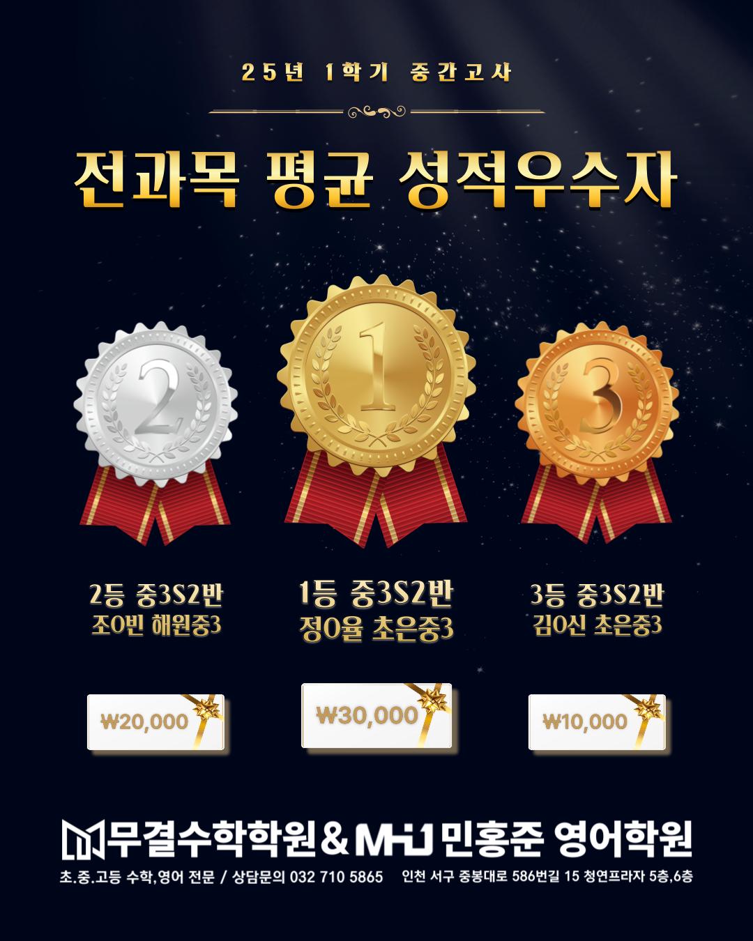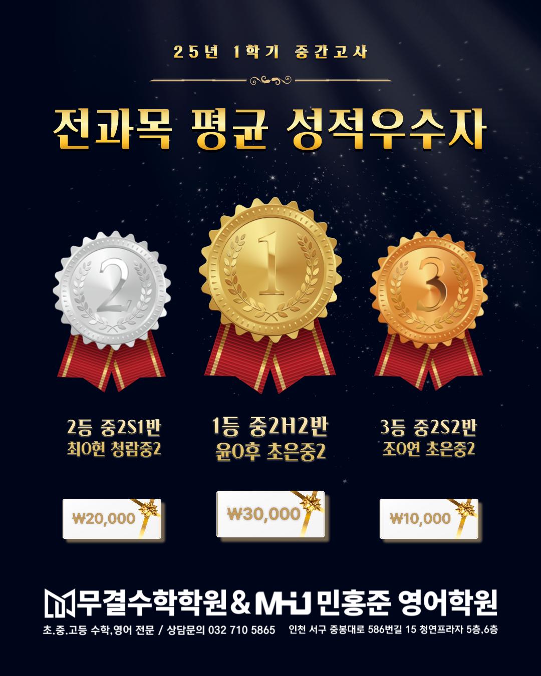 무결수학 중등부에서는 25년 1학기 중간고사를 준비하며 성적우수자 이벤트를 준비하였습니다. 학생들이 이벤트를 또 하나의 목표로 삼고 열심히 학업에 집중하도록 하기 위한 선생님들의 노력이었는데요. 무결수학학원은 이처럼 이벤트를 통해 학생들의 학습 의지를 돕고, 면학 분위기를 향상 시키기 위해 다양한 시도를 하고 있습니다. 다가오는 기말고사에도 수학100점자 등 성적 우수자 이벤트가 준비되어있습니다. 또한 중간고사 대비 기말고사 성정 향상자 (Jump - Up !)를 대상으로 한 이벤트도 준비중이니 많은 학생, 학부모님들의 관심 부탁드립니다! 해당 이벤트 상세 정보는 네이버 블로그 및 네이버 플레이스를 통해 보다 자세하게 확인하실 수 있습니다! https://blog.naver.com/mkedu0501/223874346424