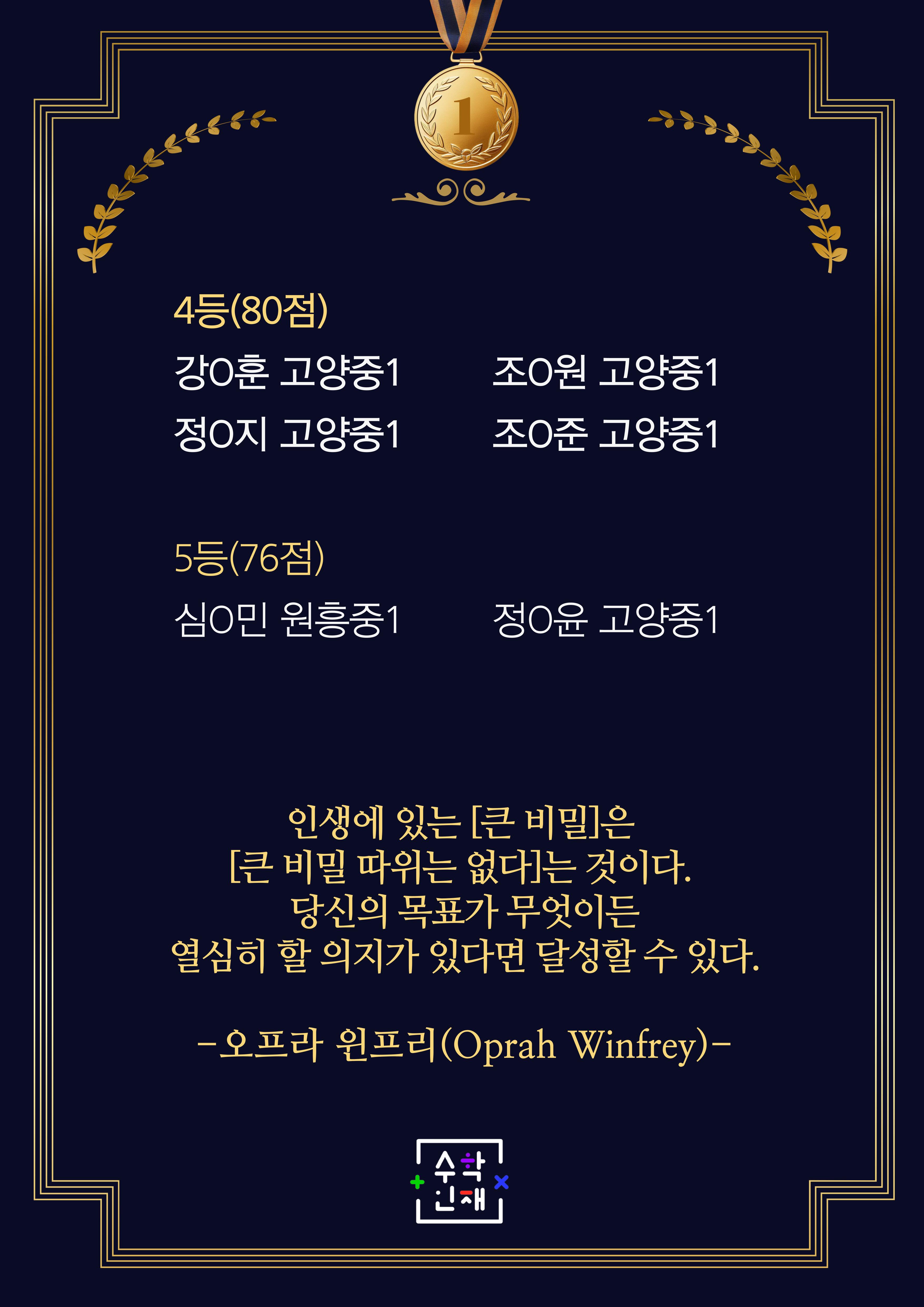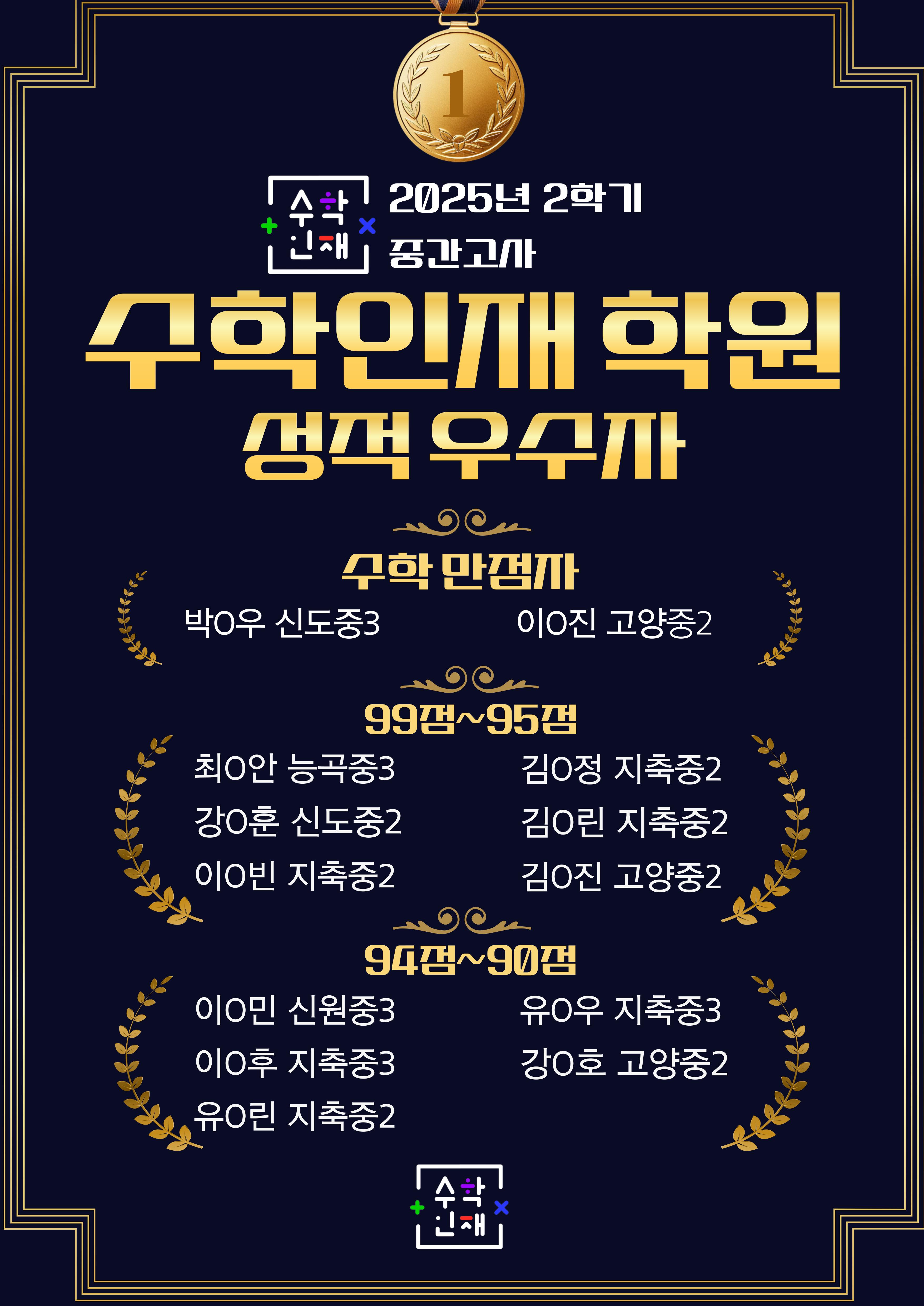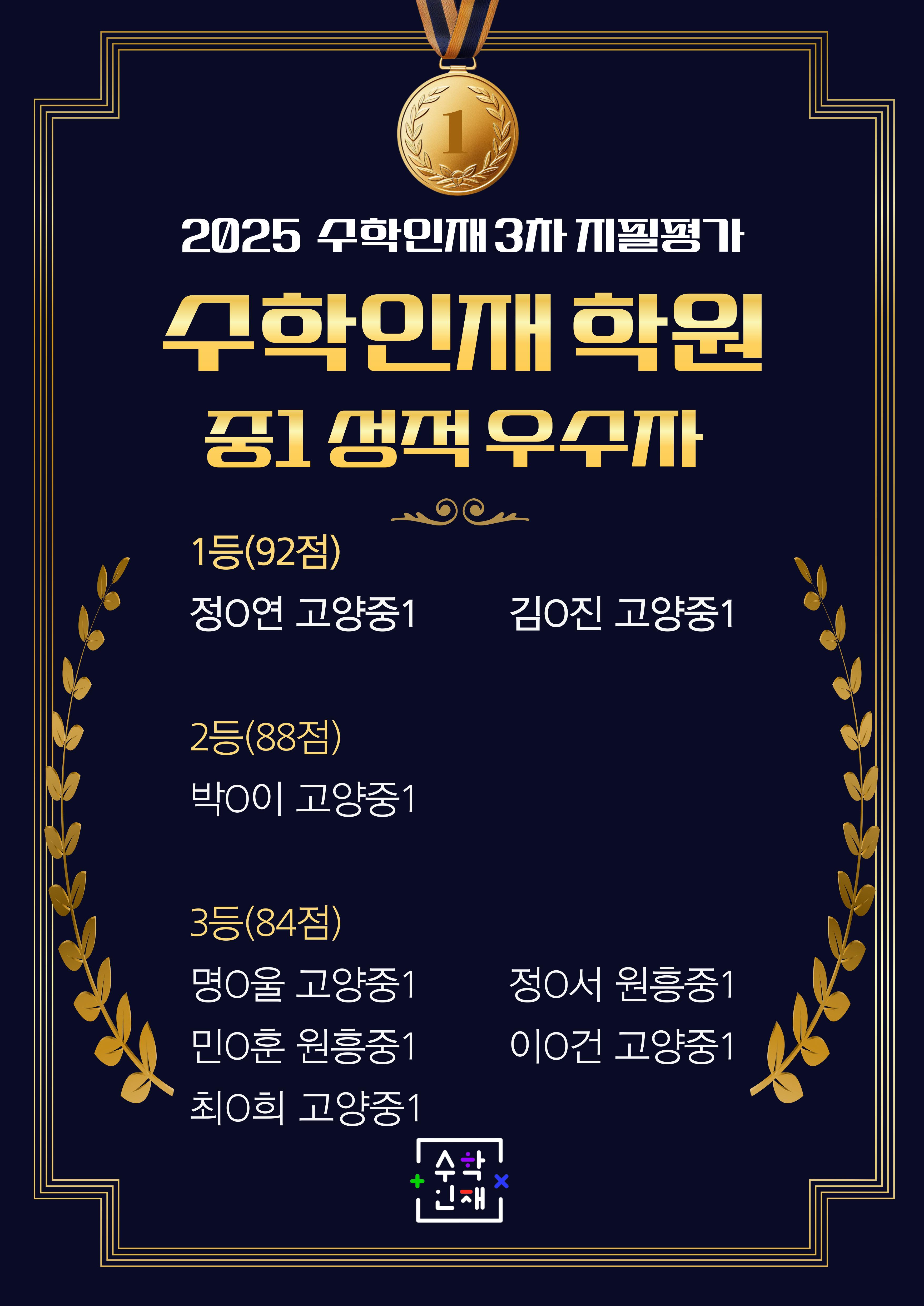 알림'성공하는 수학 교육'을 위한 '최고의 선택' 축하드립니다🎉 --삼송수학인재 학원 11월 학년별 학습 계획&주요 일정-- (수학인재 원생들의 지난 9,10월 뿌듯한 성취↓↓) 🎖️초등부 10월 KTC경시대회 21명 입상/대상 1명, 금상 2명 🎖️중등부🎖️고등부 각 학교 지필평가 만점자&상위권 다수 배출 많은 학부모님, 학생분들이 -2025년 2학기 지필평가 완벽 대비 -2026년 새 학기 수학 완벽 대비 입학문의 및 첫 등원을 시작하고 있습니다:) 간단하게 [수학인재의 11월 계획]을 알아보시겠습니다. 🎖️초등부 1. 11월 수행평가 대비 기간 2. 11월 초등부 통합 월말 평가 3. 11월 KTC 경시대회 실시 4. 초등부 원생 상담 및 2026 커리큘럼 제작 시작 🎖️중등부 1. 11월 수행평가 대비 기간 2. 11월 토요 문제 풀이 3. (중3 대상) 11월 시험대비 일요 문제 풀이 4. (중3 대상) 기말고사 대비: [백발백중 교재 풀이], [일취월장 모의고사 8회분 풀이], [인근 학교 2개년 기출 모의고사 6회분 풀이] 5. (중3 대상) 11월 학교별 기말고사 직전 보강 6. (중1 대상) 4차 지필 평가 시행 🎖️고등부 1. (고3 대상) 수능 전/후 수학인재 입시 관리/수학인재 졸업 2. 11월 수행평가 대비 기간 3. 11월 토요 문제 풀이 4. 11월 시험대비 일요 문제 풀이 ✨11/28(금)✨ 1) 2026수학인재2.0 업데이트 소개 2) 2026수학인재 윈터스쿨 프로그램 소개 블로그로 찾아뵙겠습니다! 자세한 정보는 [수학인재 네이버 블로그]에서 확인해주시기 바랍니다! 꿈과 열정을 가지고 수학인재 학원에서 뵙겠습니다!! :) -수학인재 교육문의: 02-6326-4293