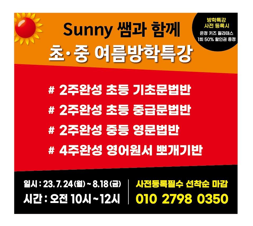 2주 초등기초영문법 (10회 2시간수업) 2주 초등중급영문법 (10회 2시간수업) 2주 중등영문법 (10회 2시간 수업) 4주 영어원서뽀개기반 1차: 7월 24일 월 개강 2차: 8월 7일 월 개강 Sunny 원장쌤과 뿌듯한 여름방학나기