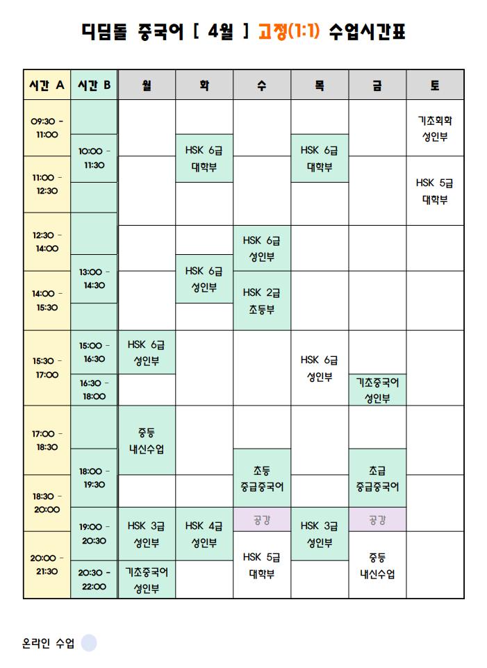안녕하세요. 디딤돌 중국어입니다. 23년 4월을 맞아 새로운 학생분들이 많이 등록해주셨습니다. 때문에 시간표에 변동이 발생하게 되어 알려드립니다 :)