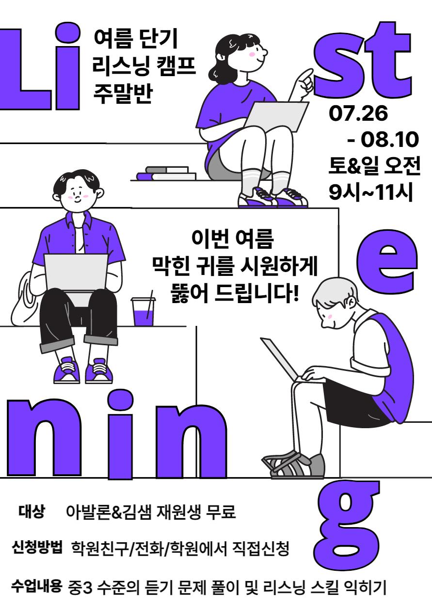 안녕하세요~ 아발론&김샘학원입니다:) 짧은 여름방학이지만 리스닝이 잘 되지않아 고민인 학생들을 위해 짧고 굵은 리스닝 캠프 주말반을 오픈합니다!!