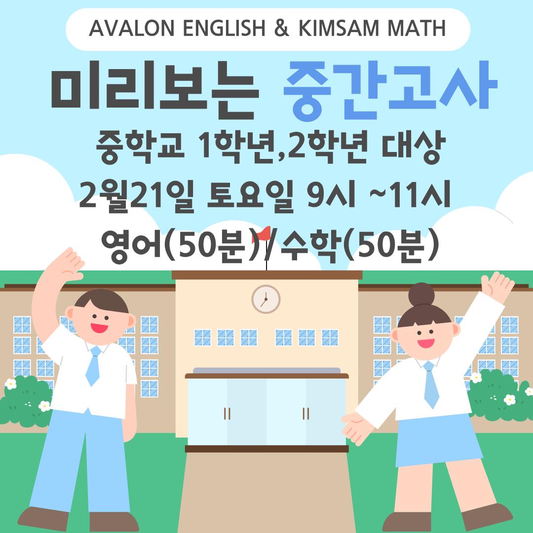 안녕하세요~ 아발론교육&김샘수학 학원입니다!! 중학교 입학을 앞둔 아이들과 중학교 1학년 2학기를 시험이 없는 학기로 보냈던 우리 아이들을 위해 미리보는 중간고사를 준비했습니다! 1학년은 작년 기출문제를 토대로 시험지를 만들었고 2학년은 원주시내 중학교 기출문제를 토대로 비슷한 난이도로 시험지를 준비했습니다~ 시험에 익숙하지 않고 감을 잠시 잃었던 아이들이 미리 보는 중간고사를 통해 아이의 현 위치를 정확하게 한번 진단해 보는 건 어떨까요? 신청해주세요^*^ ☎ 765-2662 / 766-5552