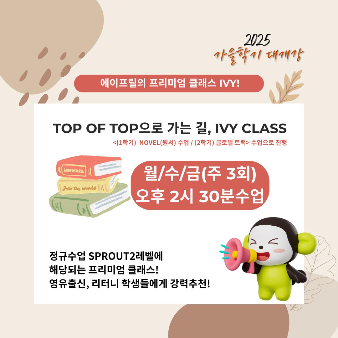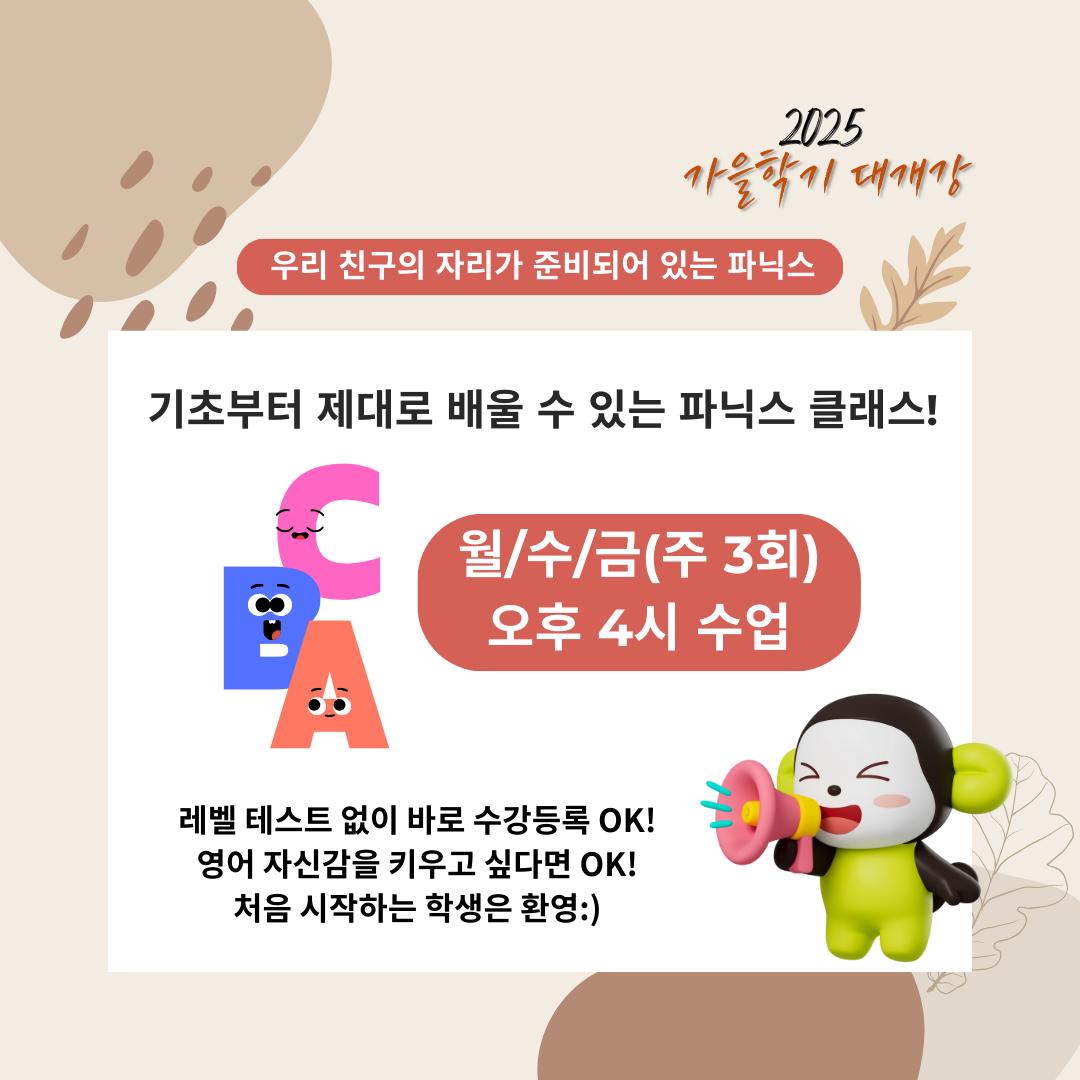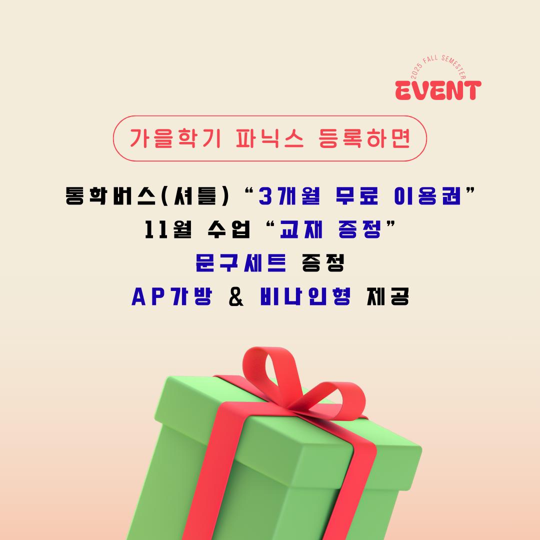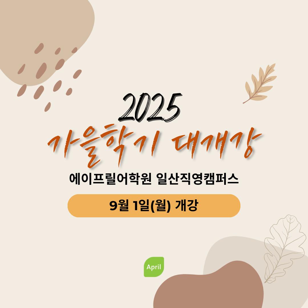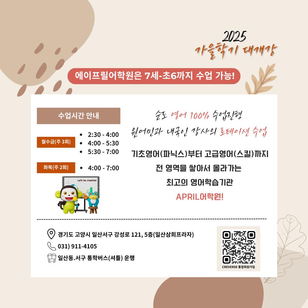 초등영어하면 에이프릴! 에이프릴하면 초등영어! 잠시 늦췄던 영어공부 가을부터는 시작해야 하지 않을까요? 에이프릴이 가을학기 개강을 알려드립니다. 또한 등록 시 푸짐한 선물도 준비되어있습니다!