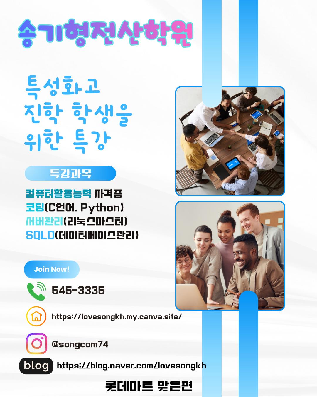 🏆 20년 경력의 명장 배출 산실! 송기형전산학원 마이스터고 진학 특별전형 특강 오픈!안녕하세요! 20년 전통, IT/컴퓨터 교육 명가 송기형전산학원입니다.기술 명장을 꿈꾸는 마이스터고등학교 진학을 앞둔 학생들을 위해 합격부터 고교 생활 심화 학습까지 완벽하게 대비할 수 있는 특별 과정을 개설합니다.