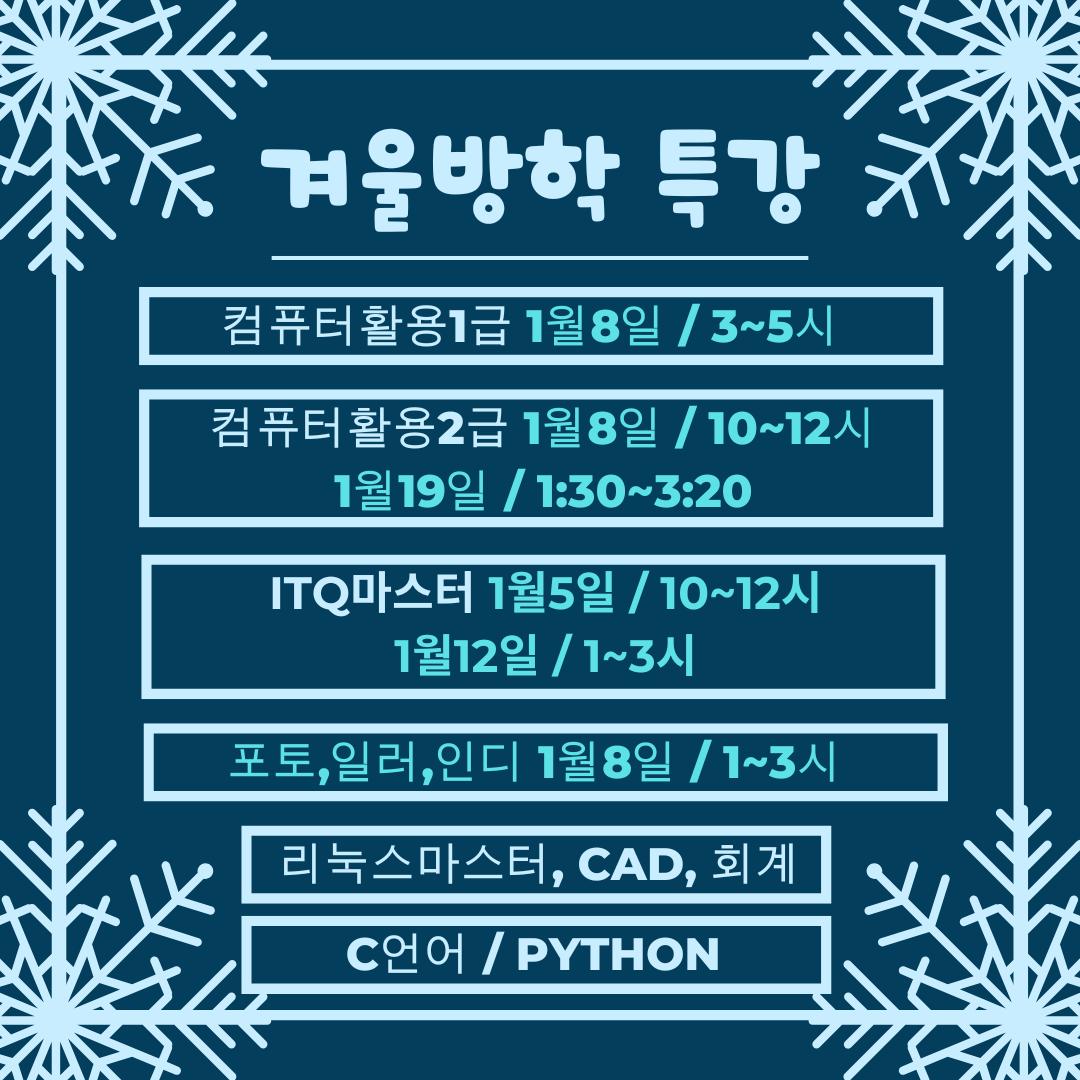 🚀 송기형전산학원 겨울방학 특강: 알찬 1월, 미래를 설계하는 특별한 기회!안녕하세요, 송기형전산학원입니다! 😃길었던 한 해를 마무리하고 새로운 시작을 준비하는 겨울방학! 이번 방학을 그냥 흘려보내지 마세요. 송기형전산학원에서는 학생들이 새 학기를 앞두고 꼭 필요한 핵심 IT 자격증 및 실무 능력을 단기간에 마스터할 수 있는 겨울방학 특강을 준비했습니다.미래 경쟁력을 키우는 가장 확실한 투자! 지금 바로 송기형전산학원의 특별한 커리큘럼을 확인하고 수강 신청하세요! 🌟 송기형전산학원 겨울방학 특강 핵심 강좌 및 일정방학 기간 동안 집중적으로 운영되는 특강 일정입니다. 원하는 강좌를 확인하시고 시간을 놓치지 마세요! 💡 참고: 컴퓨터활용능력, ITQ 마스터는 취업 및 대학 입시 시 가산점이 주어지는 필수 자격증입니다. 방학을 이용해 효율적으로 취득하세요! 🎯 특강을 선택해야 하는 이유 단기 집중 완성: 방학 기간 동안 짧고 굵게 핵심만 학습하여 실력 향상을 극대화합니다. 자격증 취득 목표: 실전 문제 풀이 중심으로 진행되어 자격증 취득 합격률을 높입니다. 미래 대비: C언어, Python 등 프로그래밍 기초를 탄탄하게 다져 4차 산업혁명 시대에 대비합니다. 실무 능력 향상: 포토샵, CAD 등 실무에 바로 적용 가능한 스킬을 습득합니다. 📝 수강 신청 및 문의특강은 정원 마감 시 조기 종료될 수 있으니 서둘러 신청해 주세요! 수강 기간: 2026년 1월 중 (강좌별 일정 상이)대상: [수강 대상 명시 - 예: 초/중/고등학생, 대학생, 일반인 등] 신청 방법: 전화, 방문 문의 전화: 545-3335 학원 위치: 롯데마트 맞은편 이번 겨울, 송기형전산학원에서 여러분의 잠재력을 활짝 펼쳐보세요! 감사합니다.