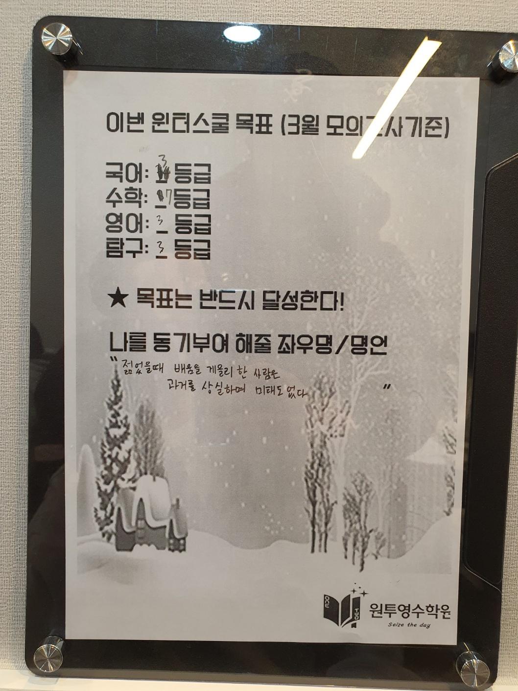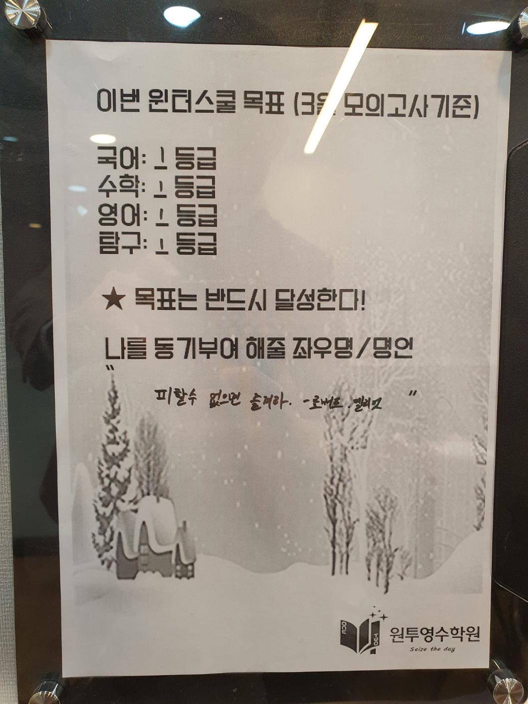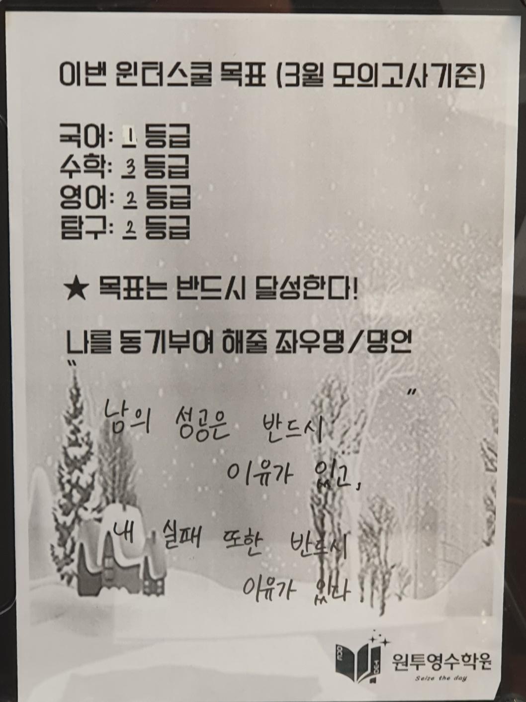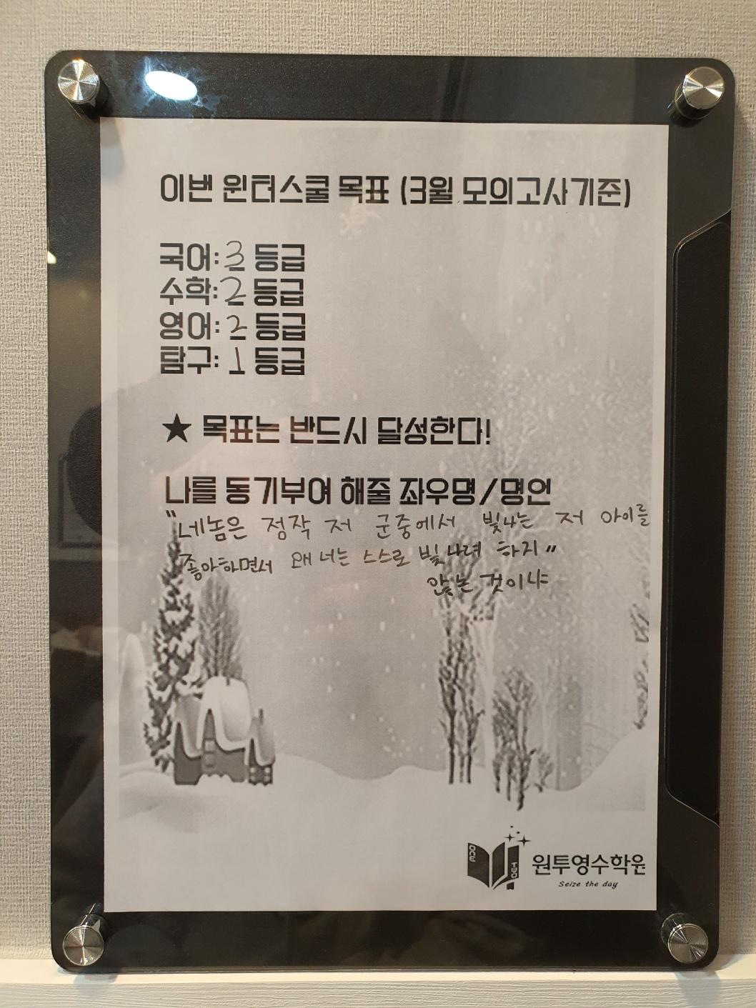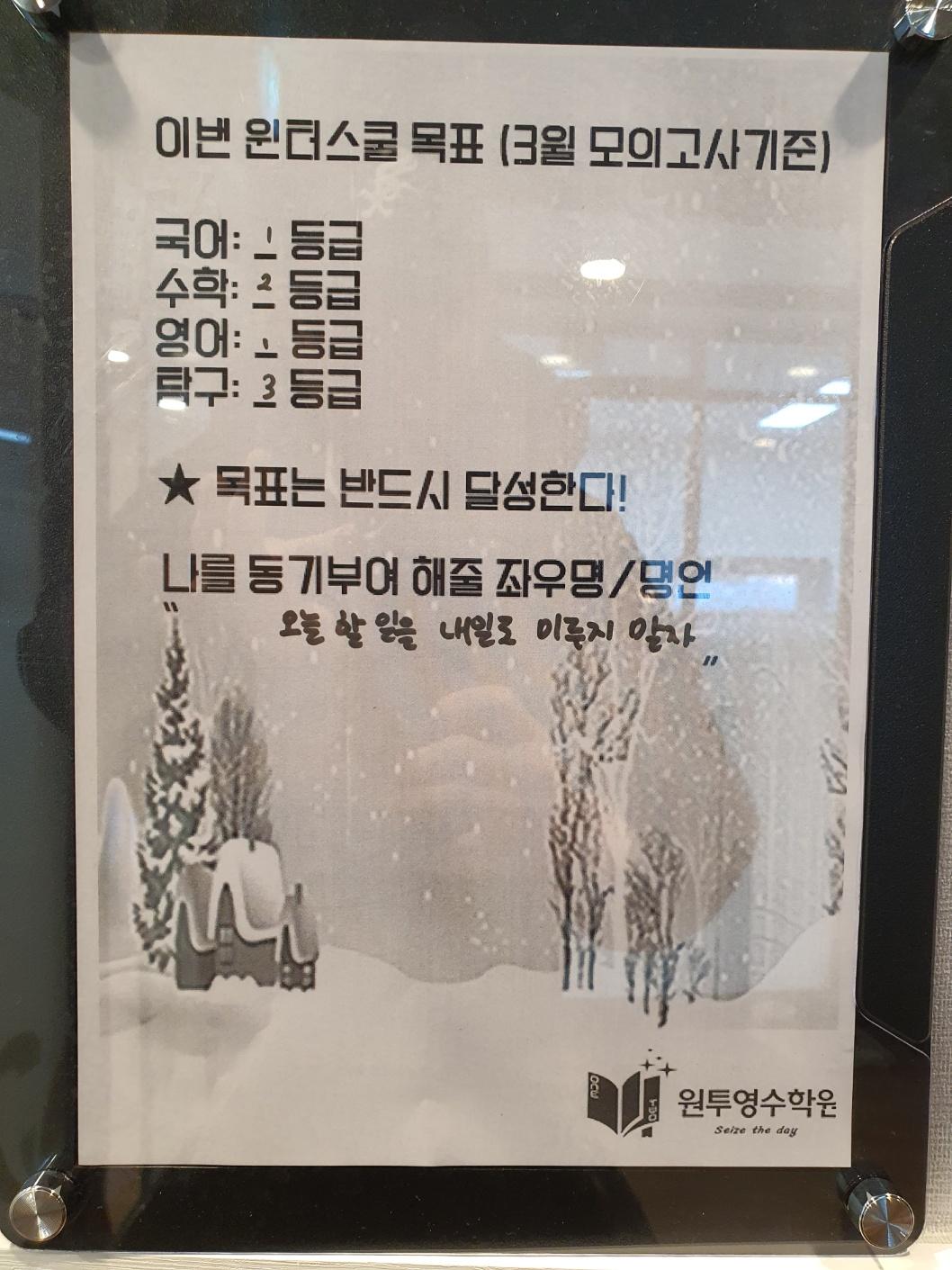 원투영수학원의 2달간 윈터스쿨을 마치며 예비고1부터 고3까지 하루 12시간 이상을 학원 자습실에서 공부를 하던 학생들 선행부터 부족한 과목 복습 매일매일 엄청난 양의 과제를 묵묵히 이겨낸 윈터스쿨 참가자들 모두 새학기 성적 대박나기를 기원합니다!! 수고하셨습니다