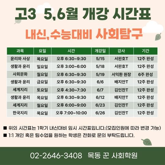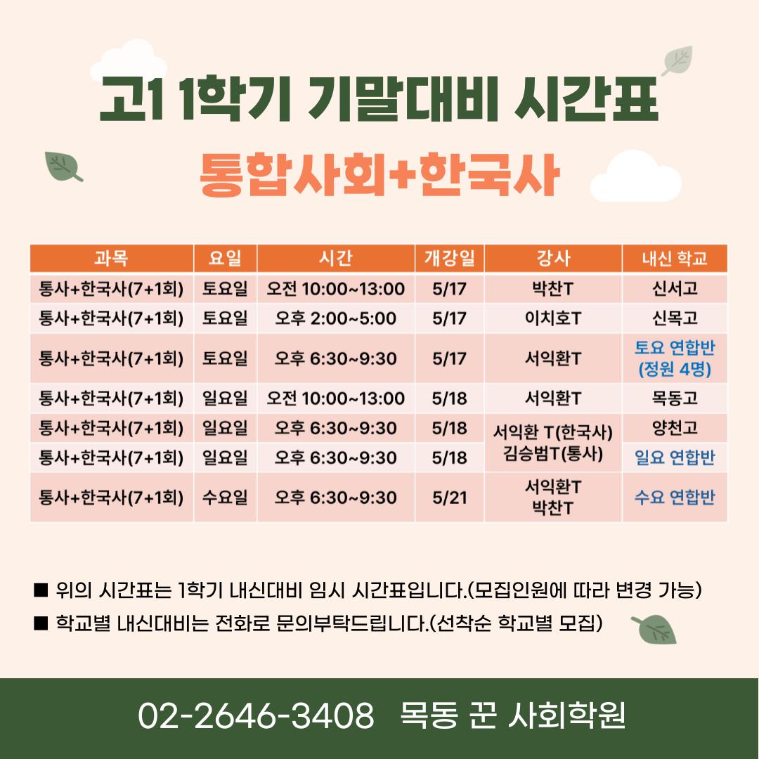 <목동 꾼 사회학원의 고1 통사+한국사 내신수업특징> ✅자체 교재 제공 ✅ 수업시간 내에 암기와 문제푸는 시간 늘려 수업중에 모두 끝내기 ✅강의시간 30분 당기고 수업후 자율 클리닉 (문제 틀린것 봐주고 암기 부족한 학생 암기추가) ✅숙제검사 철저히 하기 (회당 10문제 내외) ✅ 연합반을 줄이고 학교별 내신반을 늘려 각 학교에 맞게 철저히 대비 ✅ 학교별 내신대비 추가 개설 (신서고,신목고 추가) (목동고, 양천고 반은 기존 시간 그대로 입니다.) <목동 꾼 사회학원의 고2,3 사탐 내신수능 수업특징> ✅ 고3 각 탐구수업은 3시간씩 연속으로 진행됩니다. ✅고1 한국사 통사 수업은 학교별 맞춤수업 진행 (강서고,목동고,백암고, 신목고, 신서고,양정고,양천고, 통합반도 운영) ✅ 한국사+통합사회 수업은 각 1시간30분씩 연속으로 진행됩니다. ✅매주 지난차시 복습 테스트 진행 [1교시, 30문항, 매주 누적, 시험 결과 문자 발송] ✅복습테스트 미달 학생 개별 클리닉 진행 & 구술 테스트 통과 후 하원 ✅시험 기간 중 수업 앞뒤 무료 클리닉 진행 ■ 위의 시간표는 1학기 내신대비 임시 시간표입니다.(모집인원에 따라 변경 가능) ■ 학교별 내신대비는 전화로 문의부탁드립니다. 자세한 사항은 블로그 참조 부탁드립니다. https://blog.naver.com/ggunsociety