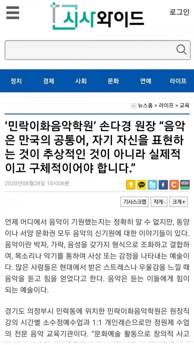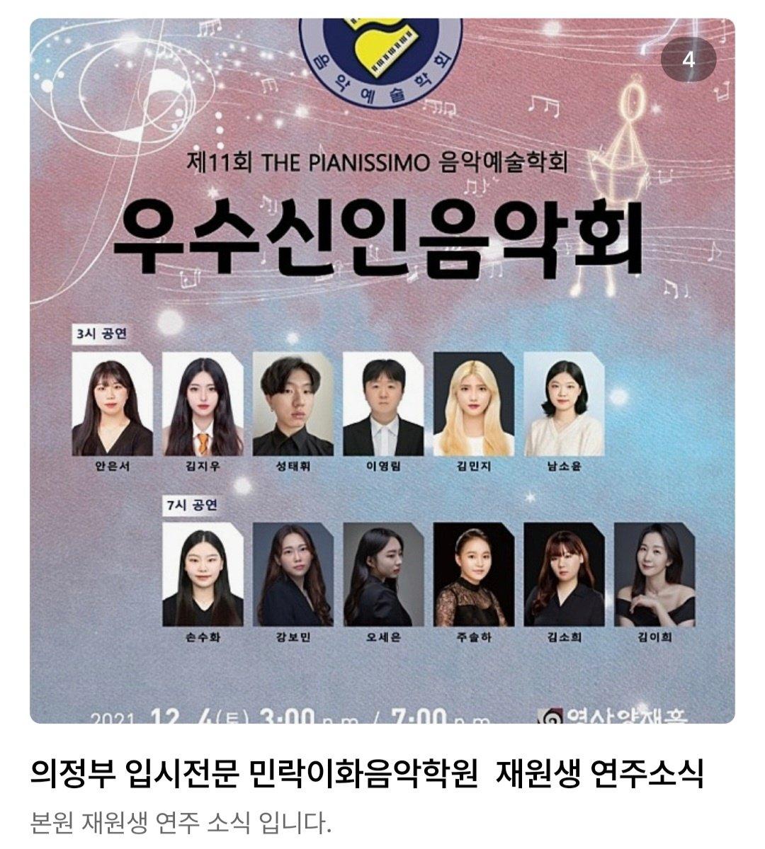 원장약력 이화여자대학교 공연예술대학원 피아노교수학전공 음악학석사 졸업 성신여자대학교 기악과 피아노전공 졸업 Hochschle fur Musik und Theater Hannover Meisterkurs fur Klavier 이수 (독일 하노버국립 음대 피아노 실기마스터 코스) 서울대학교 서양음악연구소 재즈피아노실기과정 이수(사사 - 김가온) 피아노의 밤 출연 연주 (성신여대) 향란음악회 출연연주 (성신여대) 우크라이나 국립심포니 오케스트라 협연 The ensemble 창단연주 및 멤버 한국피아노재능기부협회 창단연주회 출연연주 코스모스홀 초청 다문화가정교육지원연주회 출연연주 클라비어아밴트인하모니 리사이틀 순천향대학교 전문명사초청 특강 코스모스홀초청 연말 재능기부연주회 출연연주 클라비어콘체르토 창단연주회 출연연주 소리클라비어앙상블 창단연주회 평택학생음악경연대회 피아노부분 심사위원 위촉 외 세종체임버 홀 ,영산아트홀, 한전아트센터 ,모차르트홀, 코스모스홀 ...다수 연주 현재도 대학특강, 연주등 활발히 활동 중..... 현) 민락이화음악학원 대표 한국피아노재능기부협회이사 The ensemble 단원 'sori' klavier Ensemble 단원 음악예술학회 회원