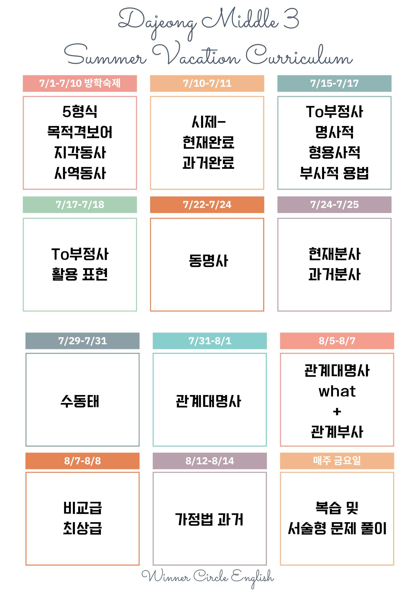 여름방학, 지금이 골든타임입니다. 안녕하세요. 다정동 위너서클영어 원장 황주현입니다. 1학기 기말고사가 마무리되어 가는 요즘, 학생들도 많이 지치고 긴장을 풀고 싶은 시기입니다. 하지만 바로 이 시기, 여름방학을 어떻게 보내느냐가 2학기 성적을 결정짓는 가장 중요한 포인트가 됩니다. ✅ 여름방학은 ‘공부 체질’을 만드는 시간 영어는 짧은 시간 안에 성적이 확 오르는 과목은 아닙니다. 특히 문법과 독해, 어휘는 꾸준한 시간 투자가 필요한 영역이죠. 방학 기간 동안 규칙적인 학습 루틴을 만들고, 약한 부분을 점검하며 실력을 쌓는다면 2학기 중간고사에서 성적 향상을 충분히 기대할 수 있습니다. <모든 수업은 원장 직강으로 진행됩니다.> 특히, 같은 학년이라 하더라도 학생 개개인의 실력에 맞춰 학습할 단어책을 다르게 배정하고, 개별 시험을 통해 반복 학습을 진행합니다. 영어 성적 향상에 있어 단어 암기만큼 중요한 것은 없습니다. 어휘력이 탄탄하게 잡혀 있어야 문법도, 독해도 자연스럽게 이해되기 때문입니다. 학생마다 단어 오답을 따로 관리하며, 암기 → 시험 → 피드백 → 오답단어 노트정리 → 반복의 루틴을 통해 시간은 들이되, 결과는 명확하게 보여주는 방식으로 운영합니다. (중등부는 매 수업 진행사항과 단어 성적, 출석, 지각 실시간 시트를 통해 학부모님들 께서 확인이 가능합니다.) 마무리하며, 성적은 결국 시간과 노력을 어디에 얼마나 집중했느냐의 결과입니다. 방학을 제대로 보낸 학생은 2학기에도 흔들리지 않는 실력을 갖추게 됩니다. 위너서클에서는 학생 한 명, 한 명의 학습 동기와 목표를 함께 설계하고 관리합니다. 부디 이번 여름, 자녀가 학습적으로 한 단계 성장하는 시간이 될 수 있기를 바랍니다. 감사합니다. 🟦 위너서클영어 원장 황주현