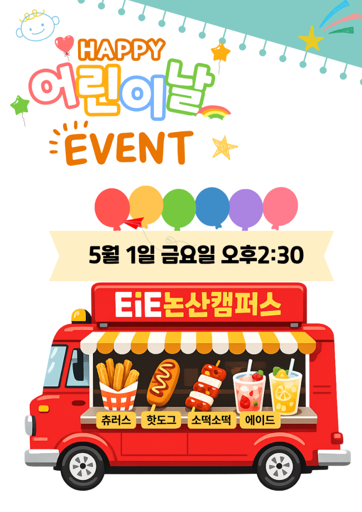 #푸드트럭 #논산푸드트럭 #논산영어학원 #eie #논산어학원 #원어민 #화산중대비 #청심국제중대비 안녕하세요! 2026년 어린이날을 기념하여 EiE에서 푸드트럭을 준비하였습니다. 매년 신나는 이벤트로 EiE어린이들을 행복하게 만들어줬던 EiE원장님 및 선생님, 직원들이 머리르 맞대어 낸 아이디어! 푸드트럭! 학원 건물에서 EiE친구들만 누릴 수 있는 신나는 푸드트럭에서 츄러스, 핫도그, 소떡소떡, 에이드 먹고 신나게 즐겨보자구요! <img src="https://blogthumb.pstatic.net/MjAyNjA0MjFfMjYx/MDAxNzc2NzYxOTAwNzU4.wnVCqa9_Z__PwYgwOV8m_JQhjC8HrzwoSwxGkuwanX4g.UrgrS79VfEASXNE6sB37h-5op40mMb6Nl1d9YpbfN-4g.PNG/%C7%AA%B5%E5%C6%AE%B7%B0__.png?type=s3" />