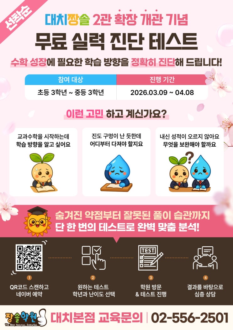 대치짱솔 2관 확장 개관 기념! "무료 실력 진단 테스트"