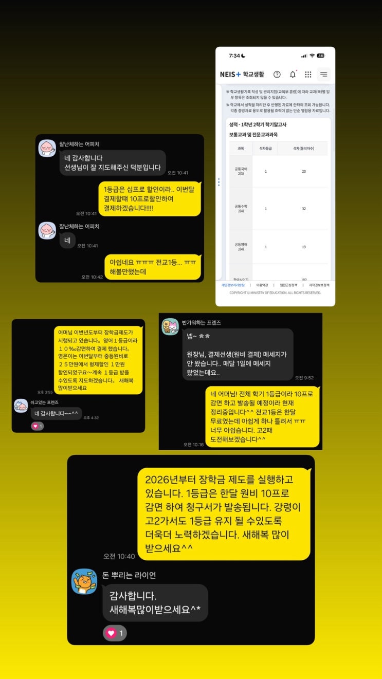안녕하세요 장유 팔판 영어 국어 전문 학원 E&K 영어 국어 전문 학원 입니다. 우리 학원에 장학금 제도가 있습니다. 학생들은 전부 “저는 해당되지 않아요” 그렇게 말하지만 혹시나 모를 주인공이 되기위해 시험기간 내내 최선을 다합니다. 우리 학원 고등부 학교는 율하고 삼문고 대청고 수업이 진행 중입니다. 과목 전교1등도 가능 했었던 두명의 친구가 있었는데 기말에 2개가 틀려 아쉽게 장학금을 놓쳤어요! 고등부 원비 28만원에서 10프로 감면 하여 252000원 결제카톡 보내드리니 어머님들께서 왜 이렇게 금액이 왔냐고 물으시더라구요. 우리아이들은 별거 아니라 생각해도 어머님들은 너무 좋아하시더라구요! 1등급 아이들은....... <img src="https://blogthumb.pstatic.net/MjAyNjAyMDJfNDkg/MDAxNzY5OTg0MjkwNzU0.w3wi3Lb6mtkfevbrIeSj6ZYD4GENQyg7K0rmwDdxVfsg._Sc4o7TfBGPiZB_LVXGOsK8ET2nUumOjsZP3iz9rqwAg.JPEG/2296D07C%A3%ADDB99%A3%AD4458%A3%ADA88B%A3%AD4FA0DDFEB1ED.jpg?type=s3" />