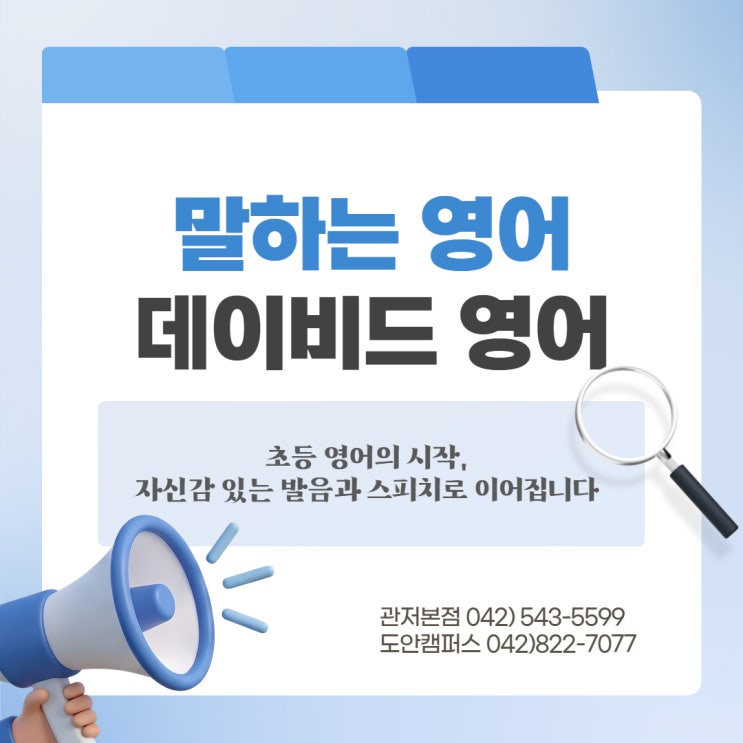 초등 영어의 시작, 자신감 있는 발음과 스피치로 이어집니다 아이들의 영어는 처음이 정말 중요합니다. 특히 초등 저학년 시기에는 영어 소리를 자연스럽게 받아들이는 힘이 크기 때문에, 이 시기의 발음교정은 영어 실력의 기초를 만드는 중요한 과정입니다. 데이비드영어는 아이들이 정확한 소리를 듣고, 바르게 따라 말할 수 있도록 세심하게 지도하고 있습니다. 초등 저학년, 확실한 발음교정 수업 처음 형성된 발음 습관은 이후 리딩, 스피킹, 자신감까지 연결됩니다. 데이비드영어는 초등 저학년 아이들이 영어를 어렵게 느끼지 않도록, 정확한 발음과 소리 훈련을 차근차근 지도합니다. 자신감을 키우는 초등 스피치 수업 영어는 배우는 것....... <img src="https://blogthumb.pstatic.net/MjAyNjAzMDVfODYg/MDAxNzcyNzA4NDc2Nzgy.27Z79WHIm5H6JuuOQ6ghwjGcaGJw0_56UuFUhMHa-kwg.qV1BVclIKQNJ7Aggt8YXue7mBkyyiMqA6Nxs5mAnMEkg.JPEG/%C1%A6%B8%F1%C0%BB_%C0%D4%B7%C2%C7%CF%BC%BC%BF%E4_%2861%29.jpg?type=s3" />