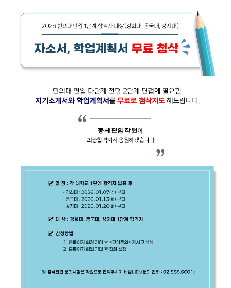 안녕하세요 동제편입학원입니다. 2026년 한의대편입 시험이 경희대를 스타트로 시작되었죠? 경희대가 벌써 1단계 합격자 발표가 나왔습니다. 경희대 처럼 1단계 합격자에 한해 자소서와 학업계획서 등을 제출해야 하는 학교들이 있습니다. 경희대, 동국대, 상지대 이 세 학교들은 1단계 합격자 발표가 나면, 자소서와 학업계획서를 작성해서 제출해야 합니다. 자소서와 학업계획서를 작성해서 제출하는 시간이 약 하루 정도로 제출 시간이 많이 촉박하기 때문에, 충분히 고민하고 작성할 시간도 많이 부족하고, 막상 작성해놓고도 제대로 작성한게 맞는지, 혼자 고민되고, 많이 불안하실 겁니다. 동제편입학원이 도와드리겠습니다. 1단계 합격 하....... <img src="https://blogthumb.pstatic.net/MjAyNjAxMDhfMTIw/MDAxNzY3ODM2ODE3MDQ5.nx1x9VYIbzKkD7Kn3Nq8xvaXCOpTcp4iifNPQJnWh6wg.wVMHAPwiKCXqkj8luJXso9kHWEK6HTCQhJaUVP-rOCEg.JPEG/%C0%DA%BC%D2%BC%AD%B9%AB%B7%E1%C3%B7%BB%E8%282026%29.jpg?type=s3" />