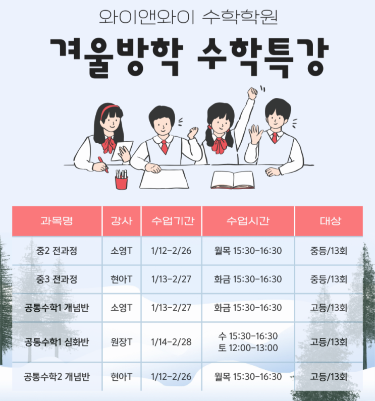윤인선 화학 # 확실히 이해하는 화학 # 화학 겨울방학 8회 # 화학이 어려운 학생, Level Up의 기회 * 화학 전범위 개념+심화 * 1-2-3-4단원 * 핵심 개념+문풀 스킬 * [내신+수능]의 실전 문제 * 매주 [암기+실전] test * 매주 담당t의 직접 클리닉 (조교의 질문답변x) * [과제+시험] 결과 전송 * 킬러단원(1,4)단원 매주 복습 송란국어 내신수능 통합국어 # 내신국어와 수능국어 동반상승 # 내신 때 내신하고 수능 때 수능하며 # 시기별 필수 내용을 효율적, 체계적으로 학습 # 내신도 수능도 버리지 않아야 진짜 실력 상승 # 숙제는 학원에서 관리하에-과제관리 * 방학 동안 수능 전영역 학습 (2학년 1학기 내신범위인 문학비중 up!) * 문법 기....... <img src="https://blogthumb.pstatic.net/MjAyNTEyMTNfMTE0/MDAxNzY1NjAzNDcyODQ4.OaZvWrg82FHn1zyAqb8KxlskGqbHTXUjoBgzZbWW4mgg.M1MZumZjzQU8yMUZwWW_2g75wPWuj0GpzQjgStcN-aog.PNG/25_2%C7%D0%B1%E2_%B1%E2%B8%BB_%BC%DB%B6%F5%B1%B9%BE%EE_%281%29.png?type=s3" />