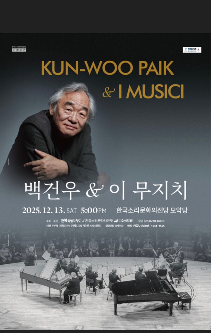 오래전 피아니스트 백건우님이 바닷가에 피아노를 놓고 모차르트의 ‘작은 별 변주곡’을 연주 하던 영상을 본 적이 있습니다. 파도 소리와 함께 흐르던 그 연주는 오래도록 마음에 깊은 울림으로 남아 있었습니다. 백건우 님은 노익장을 과시하듯 올해에도 새로운 앨범을 발표하며 무대에 서시는 현역인 음악인 입니다. 그래서 백건우님이 전주에서 콘서트를 연다는 소식을 들었을 때 꼭 가고 싶은 마음이 들었습니다 70년 전통을 자랑하는 이무지치 앙상블에 완성도 높은 연주와 백건우 님의 천상에서 흘러나오는 듯한 공기반 피아노 반의 소리는 그 자체로 깊은 감동이었습니다. 힘을 주지 않고 자연스럽게 흐르는 피아노 선율은 현악과 완벽....... <img src="https://blogthumb.pstatic.net/MjAyNTEyMTZfMTIw/MDAxNzY1ODE0NzU5Mzgz.04Th7P5o5faomaTEhHs6NQT39kQdQEOroZ-CmsM0rkUg.MYnCyDIah73c9WxbcBuOBKZk0C3f-OmsZI30PBhqBVIg.JPEG/IMG%A3%DF9131.jpg?type=s3" />