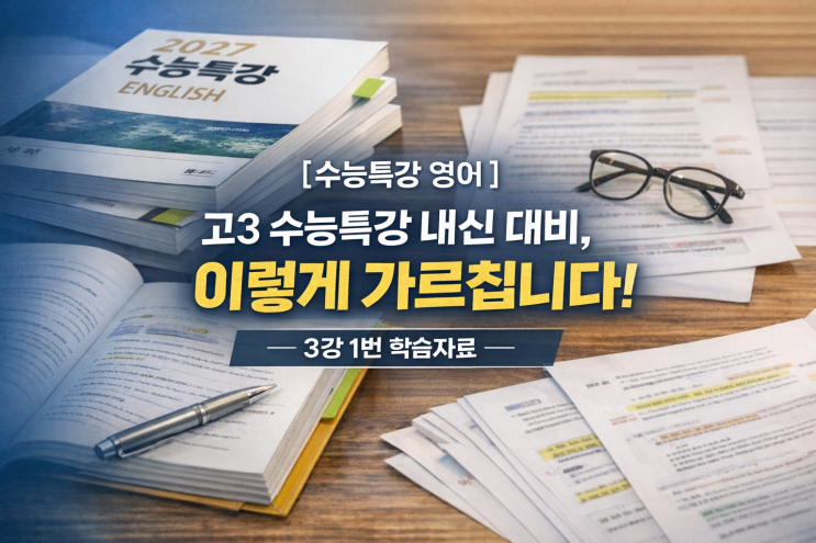 수능특강은 단순한 ‘풀이 교재’가 아닙니다 고등학교 3학년 영어 내신 범위는 수능특강에서 시작합니다. 보통 약 10강 내외, 60여 개 지문 여기에 3월 모의고사 지문까지 포함하면 총 80지문 안팎 분량도 많고, 무엇보다 지문의 성격이 완전히 달라집니다. 수능특강부터는 글의 ‘급’이 달라집니다 수능특강에 실린 글들은 중간·기말에 보던 고1·고2 지문과 다릅니다. 주제가 넓고 내용의 깊이가 깊고 하나의 글 안에 여러 출제 포인트가 동시에 숨어 있습니다 그래서 고3 학생들이 가장 많이 하는 말은, “이 글에서 도대체 뭐가 나올지 감이 안 잡혀요.” 문제를 맞히는 것과, 고3 내신을 대비하는 것은 다릅니다 수능특강을 혼자 공부하면....... <img src="https://blogthumb.pstatic.net/MjAyNjAyMDVfNzEg/MDAxNzcwMjE4MTczMzc0.tVnjTWxKXD7qJmWVoioCdf1cgRgoKSVfJ0fENPllGiEg.1l4qKPN3afKsmVg0tixTR9Hi2RoO1gtJMkX0W7UtNFog.PNG/image.png?type=s3" />