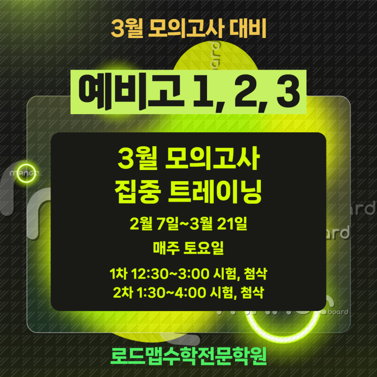 안녕하세요. 목동수학의 자존심 부평 삼산 로드맵수학학원입니다. 예비 고1·2·3 모의고사 집중 트레이닝 안내 다가오는 새 학기를 대비하여 예비 고1·고2·고3 학생 대상 ‘모의고사 집중 트레이닝’ 프로그램을 운영합니다. 본 프로그램은 실전 모의고사 훈련과 함께 ✔ 시간 관리 연습 ✔ 문제 유형 분석 ✔ 오답 정리 및 약점 보완 을 집중적으로 진행하여, 고등 과정에서 반드시 필요한 실전 대응력과 점수 향상 기반을 만들어주는 과정입니다. 기간 : 2월 7일 ~ 3월 21일 시험일 : 매주 토요일 1차 : 오후12:30~2:00 시험 / 2:00~3:00 첨삭 2차 : 오후 1:30~3:00 시험 / 3:00~4:00 첨삭 (1차, 2차 중 선택 후 시험 진행) ....... <img src="https://blogthumb.pstatic.net/MjAyNjAyMDZfMjcz/MDAxNzcwMzY3MTIwOTU2.o5NQ3EiANm8y--TeeOh1rwRFMOuotyMIADCe5DYOLLUg.0SuhUjQhSMl9kNOY37GKBNyhe9Y6w9k7KYCx-4-IXA8g.PNG/%C1%A6%B8%F1%C0%BB_%C0%D4%B7%C2%C7%CF%BC%BC%BF%E4_%289%29.png?type=s3" />