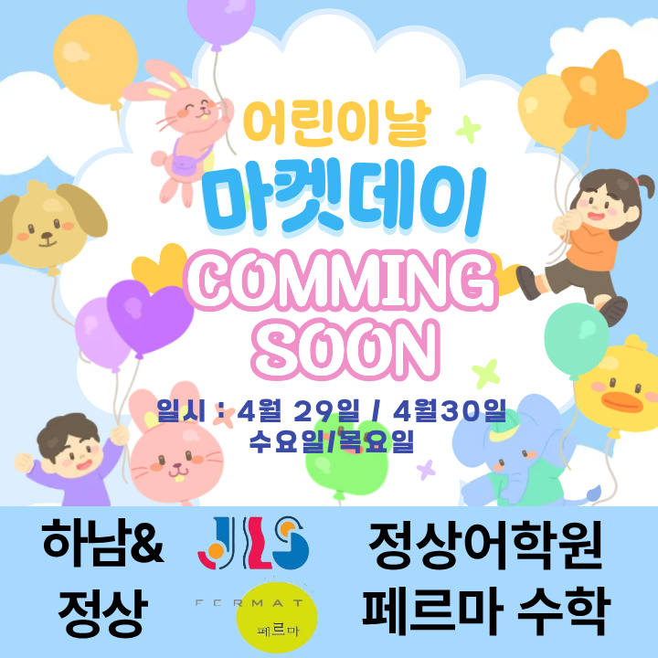 안녕하세요 ~~ 우리 학생들이 열심히 공부하고, 공부한 결과로 받은 쿠폰을 이용해 마켓데이 행사를 즐기며 또다시 공부할 동기를 찾게 만들어주는 정상어학원 페르마수학입니다 ~♥ " 올해 마켓데이 날짜가 변경되었어요 ~ " 5.1일 실시하려던 계획이 정부의 5.1 공휴일 발표에 따라 4월 29일(수)과 4월 30일(목) 에 열리게 되었습니다 ~ ♪ 수요일과 목요일은 2시간 수업하는 요일이라서 1시간은 영어, 수학 정규수업을 진행하고, 1시간은 어린이날 행사를 진행할 예정입니다 ~ 1시간 어린이날 행사에서 우리 친구들은 마켓에서 여러 물품도 사고, 영어 편지쓰기, 창의사고력 수학문제풀기 등 즐거운 시간을 보낼 계획입니다 ~ 이번....... <img src="https://blogthumb.pstatic.net/MjAyNjA0MDNfMjQw/MDAxNzc1MjE4Nzc2NTMy.vpkobdov3WCeob50_9aNv7X_Nx-XkuNbeUIU9raOk_og.YH8ZjaXV4rW-OB86QNKIycQX8ZVJGx-wBAFF1l4hXdcg.PNG/%B8%B6%C4%CF%B5%A5%C0%CC_%281%29.png?type=s3" />
