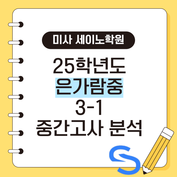 안녕하세요, 은가람중 내신대비 수학학원 미사 세이노입니다. 은가람중학교는 4월 27일부터 28일까지 이틀 동안 2, 3학년의 1학기 중간고사가 있을 예정입니다. 어느 정도 중학교 생활에 대한 경험이 쌓였을 2, 3학년들이지만, 시험은 아무리 봐도 새롭고 긴장되는 게 당연합니다. 특히, 중3들은 중학교에서의 마지막 해이기도 하고 고입을 준비한다면 1학기 성적이 중요하기 때문에 더더욱 큰 긴장을 안고 준비를 하게 될 수도 있습니다. 미사 세이노와 함께 지난해의 중간고사 분석을 해보면서, 나는 이번 달 어떤 부분에 초점을 맞춰 공부하는 게 좋을지 계획을 더 구체화하도록 해봅시다. [시험 범위] : 제곱근 ~ 인수분해 [문항 총수] : 23개....... <img src="https://blogthumb.pstatic.net/MjAyNjA0MDVfMTM2/MDAxNzc1MzYyNzM0NzIw.JJGWvduSaXBVS1IFQKrzibrIysOcbMW_spDm3C1KJm4g.A6yQP_Q1tD3h_9r8Ma-evaQmZopoHOWQfysCYLZuYnEg.PNG/001.png?type=s3" />