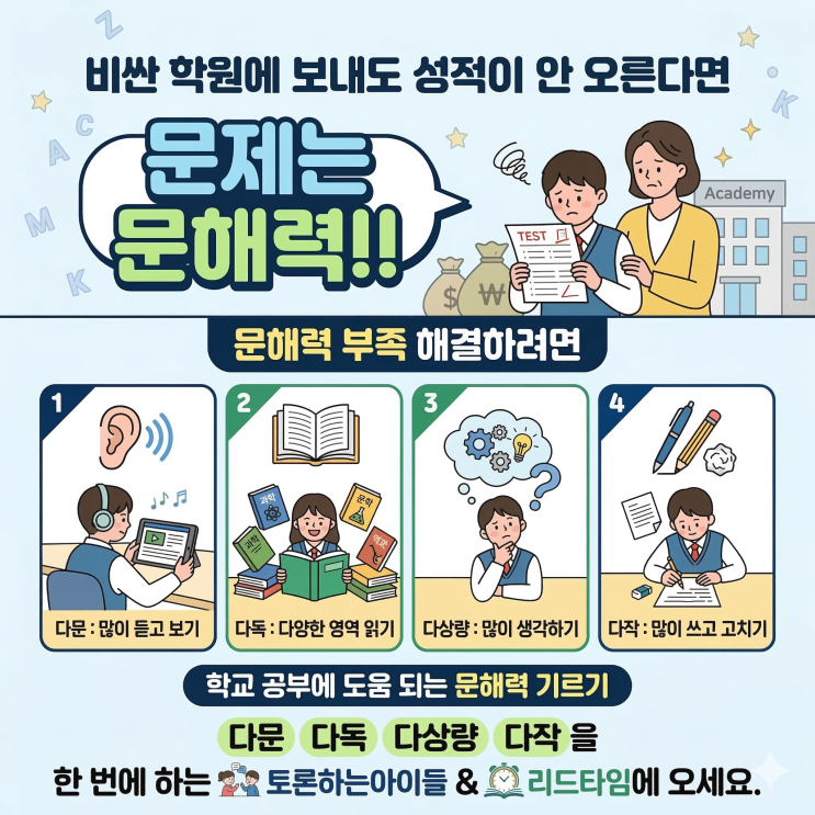 요즘 영수보다 독서토론논술을 우선 챙기는 학부모님들이 많아요. 학교 시험 변화, 빠르게 확산하는 IB교육, 문해력 기반 없이 국영수사과 점수 올리지 못한다는 사실 체감,,,,, 독서토론논술디베이트 수업 업력 30년 토론하는아이들 & 리드타임에서 독서논술 수업 완성도를 높이는 데 집중하면서 학부모님들의 논술수업에 대한 기대치도 매우 높아졌어요. 우리 아이 문해력, 이 신호 보이면 반드시 잡아야 합니다 아이 공부를 시키다 보면 이런 말을 자주 듣게 됩니다. “그냥 재밌었어” “무슨 뜻인지 모르겠어” “왜 그렇게 생각했는지 모르겠어” 많은 부모님이 이걸 집중력 문제, 노력 부족, 또는 공부 습관 문제라고 생각합니다. 하....... <img src="https://blogthumb.pstatic.net/MjAyNjA0MDZfMTE5/MDAxNzc1NDM1MTE2MTU3.KeilgNnZ2QUxF7Fq9LJq_KeC_rE62-YJux2L2RyUbu0g.rxxoSo4Vgprs7ISLJotQQyfyY5x5Q1z03MXTjZ7_AX4g.PNG/0000000000000000_%289%29.png?type=s3" />