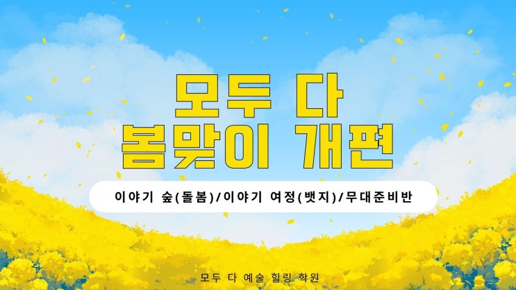안녕하세요, 용인 연기, 뮤지컬 학원 모두 다 예술 힐링 학원 입니다. 아이들을 가르치며 이런 생각을 자주 하게 됩니다. 아이들에게 학원은 단순히 배우는 공간이 아니라 마음을 쉬고, 자신을 표현하고, 친구들과 함께 성장하는 공간이 될 수 있다는 것을요. 그래서 이번 봄, 우리 학원은 아이들의 성장 과정이 더 잘 보일 수 있도록 새로운 프로그램으로 개편하게 되었습니다. 이야기 숲 – 방과 후 돌봄 프로그램 아이들이 편안하게 머물며 이야기를 만들고, 표현 활동을 하고, 친구들과 어울리는 예술 기반 돌봄 프로그램입니다. 단순히 시간을 보내는 돌봄이 아니라 아이들이 자연스럽게 표현력 자신감 사회성 을 키울 수 있도록 운영....... <img src="https://blogthumb.pstatic.net/MjAyNjAzMDlfMjU0/MDAxNzczMDUxMDkyMzgx.UHaW_Y22wE8_ifruxqWa8FXs73AYqWcU0iNf6nTBZbQg.HB_ZZ75Y7tu4MF5GmWpimkSmoAV1bntqaX8v8mvghTog.JPEG/1.jpg?type=s3" />