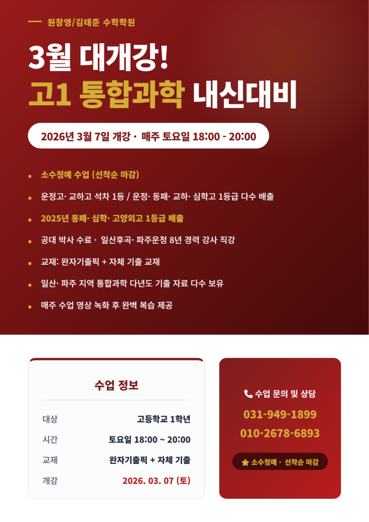 학원등록번호 : 1840호(고등부), 2066호(중등부) 학원비 과학 - 200,000원 수학과 동시수강할 경우 180,000 <img src="https://blogthumb.pstatic.net/MjAyNjAyMjNfMzUg/MDAxNzcxODE4NTUxMzQy.axmjwVV8NpbKrC1g1vvZt110ZX4jKL1o68qdiSJItIcg.sPOdK7gVj21tzf6VaR3JXpNco6UCi_htcXK4sthzptsg.PNG/%B0%ED1_%C5%EB%C7%D5%B0%FA%C7%D0_%B0%B3%B0%AD_%C6%F7%BD%BA%C5%CD.png?type=s3" />