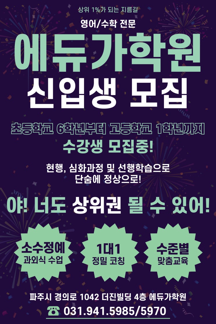 안녕하세요 에듀가 학원입니다. 7명의 선생님께서 레벨테스트로 진학 가능한 수업반 외에 개별 반을 추가 개설하여 학습이 힘든 학생들도 배움이 늦은 학생들도 늦게 시작한 학생들도 학습의 기회를 제공하고 있습니다~!!! 저희는 광고와 시설투자보다는 한 명 한 명의 학생을 정성과 열정으로 전부 10년 이상의 베테랑 선생님이 지도하고 있습니다~!!! 에듀가 학원은 운정 내에서 10년 넘은 수업 경험으로 완벽한 내신대비를 하고 있습니다. 성적뿐 아니라 아이들이 지치지 않고 즐겁게 공부할 수 있도록 지도하겠습니다.~ 문의주세요~ 평일 15:00~22:00 토요일 10:00~15:00 031-941-5985 한빛마을 9단지 맞은편에 있습니다.~ <img src="https://blogthumb.pstatic.net/MjAyNjAxMTdfMjEz/MDAxNzY4NjE4ODgwNzk1.9SnkShPhYNDkUSQ_aUm-Swi5HK2ZUT0jq6yYCaDzG9cg.654Zu6P9yRslfKQ9in1HnAn6uk1fOm_fjY8rnBatkFwg.JPEG/%BD%C5%C0%D4%BB%FD-%B8%F0%C1%FD_%C3%CA%B5%EE-%B0%ED_%C1%DF1_-001.jpg?type=s3" />