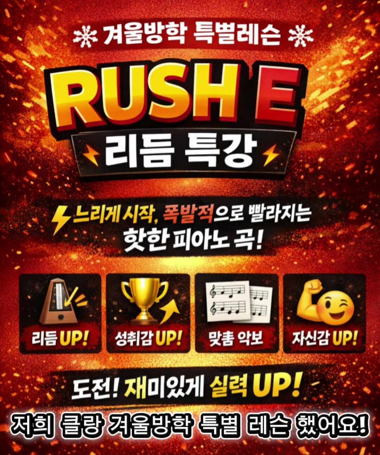 안녕하세요 :) 송정동 클랑음악학원입니다. 이제 곧 개학이네요 긴 겨울방학, 아이들 어떻게 보내셨나요? 저희 학원은 이번 방학 동안 요즘 아이들 사이에서 정말 핫한 피아노 곡 ‘Rush E’ 리듬 특강을 진행했어요 유튜브·틱톡에서도 많이 보셨을 거예요. 처음은 천천히 시작하지만, 점점 폭발적으로 빨라지는 구조라 리듬감과 집중력이 정말 중요한 곡이죠 아이들이 “이 곡 꼭 쳐보고 싶어요!” 하며 눈이 반짝이던 모습이 아직도 생생해요. 사실 원곡은 난이도가 상당히 높지만, 저희는 기초부터 차근차근 접근할 수 있도록 '과정별 맞춤 악보'를 따로 준비해서 누구나 도전해볼 수 있게 지도했습니다. “선생님, 너....... <img src="https://phinf.pstatic.net/image.nmv/blog_2026_02_28_91/7IMc5ywLzb_03.jpg?type=f480x480" />